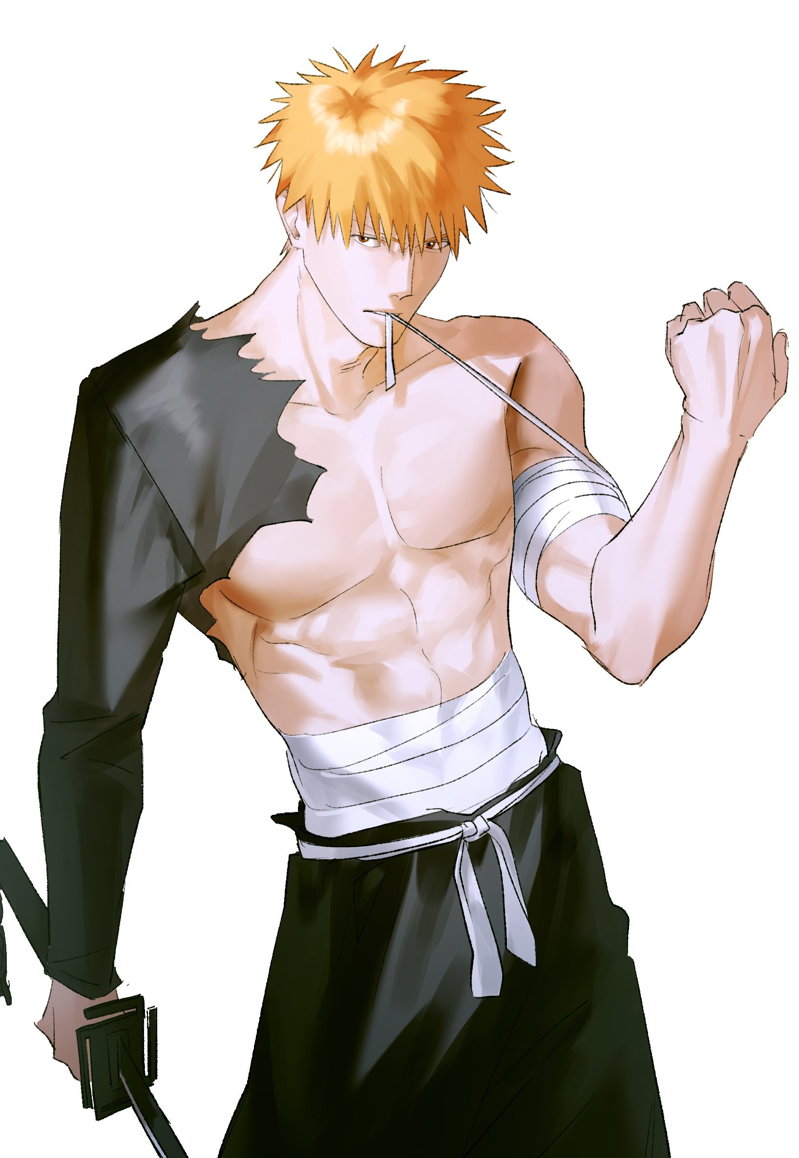 1boy abs adam's_apple applying_bandages bandaged_arm bandaged_torso bandages bankai bleach collarbone commentary_request highres korean_commentary kurosaki_ichigo male_focus no_nipples orange_hair pectorals shihakusho short_hair simple_background solo tensa_zangetsu_(bankai) white_background xatavo9919 zanpakutou