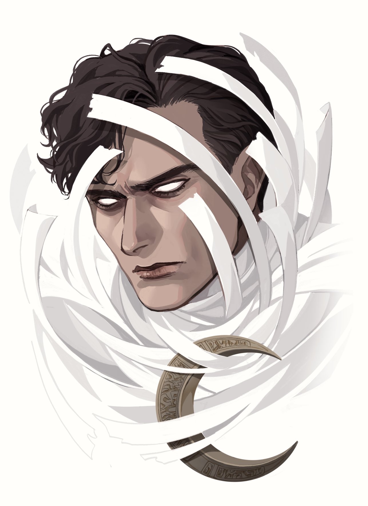 1boy bandages brown_hair commentary crescent dark-skinned_male dark_skin english_commentary highres leonesboss male_focus marc_spector marvel moon_knight moon_knight_(disney+) no_pupils portrait short_hair solo white_background