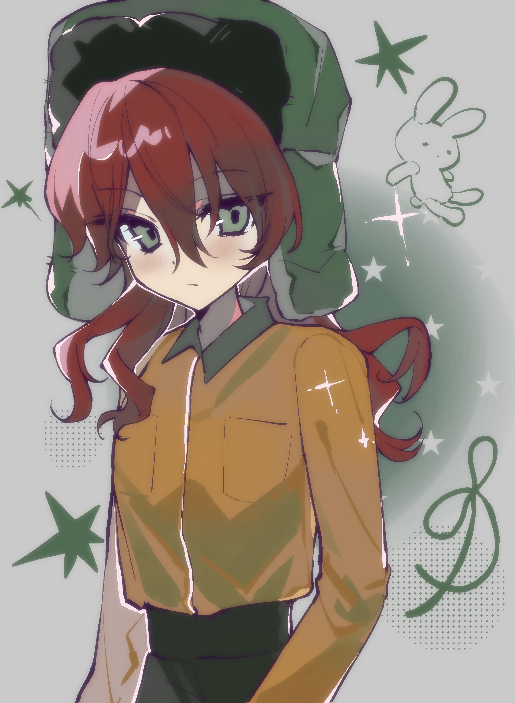 1girl arms_at_sides bazha_heiheihei chinese_commentary collared_shirt commentary_request dress_shirt genderswap genderswap_(mtf) green_background green_eyes green_hat hat highres inverted_eyelashes kyle_broflovski long_hair looking_at_viewer red_hair shirt solo south_park stuffed_animal stuffed_rabbit stuffed_toy tsurime upper_body ushanka yellow_shirt