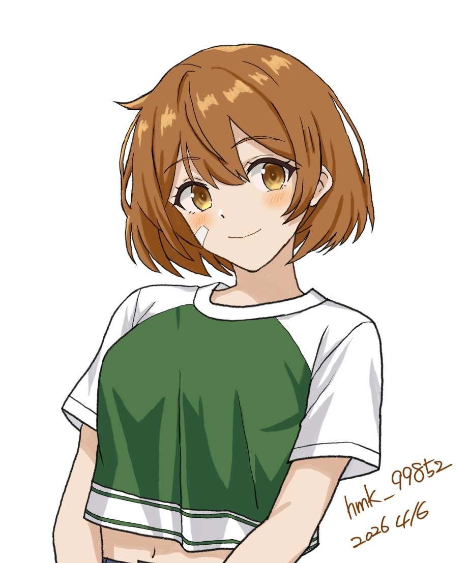 1girl bandaid bandaid_on_face brown_eyes brown_hair chuchu_tako closed_eyes commentary_request dated green_shirt kantai_collection oboro_(kancolle) oboro_(sasebo_2023)_(kancolle) one-hour_drawing_challenge raglan_sleeves shirt short_hair simple_background solo twitter_username upper_body white_background