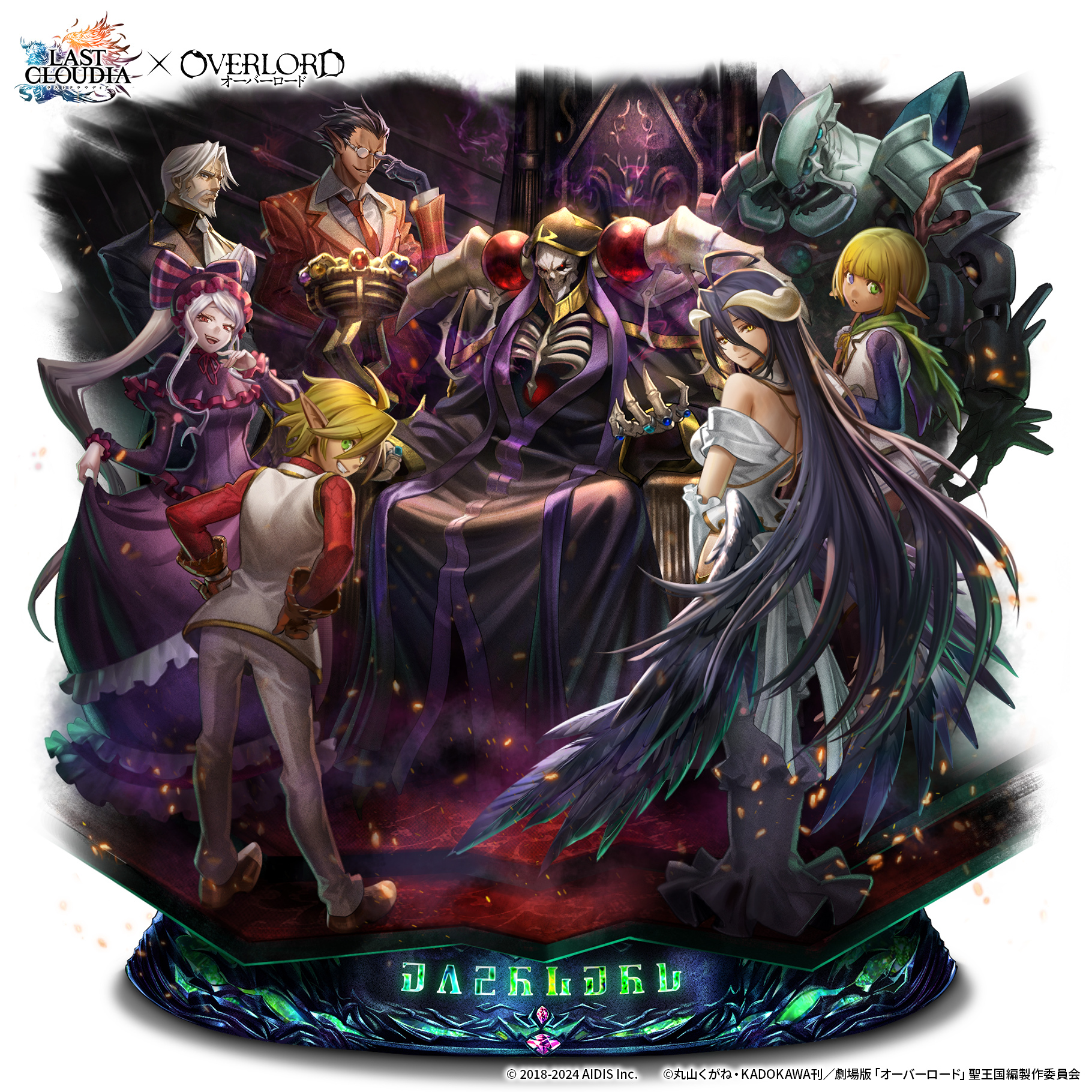 3girls 5boys ahoge ainz_ooal_gown albedo_(overlord) arthropod_boy aura_bella_fiora bare_shoulders beard black_feathers black_gloves black_hair black_robe black_suit black_wings blonde_hair blue_eyes blunt_bangs bone bonnet bow breasts brother_and_sister butler cape clothing_cutout cocytus_(overlord) commentary_request crossdressing crossdressing_(mtf) dark_elf dark_skin demiurge_(overlord) demon_boy demon_girl demon_horns dress elf extra_eyes extra_pupils facial_hair fang feathered_wings feathers formal_clothes frilled_dress frills full_body glasses gloves gothic_lolita green_cape green_eyes grey_hair hair_between_eyes hair_bow hair_slicked_back heterochromia highres hip_vent holding holding_staff horns jewelry large_breasts last_cloudia lich lolita_fashion long_hair long_sleeves looking_at_viewer low_horns low_wings mare_bello_fiore multiple_boys multiple_girls necktie no_earrings official_art old old_man open_mouth orange_suit overlord_(maruyama) pale_skin pants pinstripe_pattern pinstripe_suit pointy_ears ponytail red_eyes reverse_trap robe round_eyewear sebas_tian shalltear_bloodfallen shirt short_cape short_hair siblings sitting skeletal_arm skeletal_hand skeleton skirt skull slit_pupils smile staff striped_bow suit throne tomboy trap undead vampire very_long_hair vest white_dress white_gloves white_hair white_horns white_vest wings wooden_staff yellow_eyes