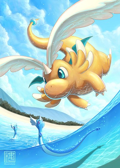 beach blue_sky claws cloud colored_skin commentary day dragon dragonair dragonite english_commentary evolutionary_line feathered_wings flying gen_1_pokemon head_wings horns illoustrationsz mega_dragonite mega_pokemon nintendo no_humans ocean orange_skin outdoors partially_submerged pokemon pokemon_(creature) pokemon_focus single_horn sky tail water wings