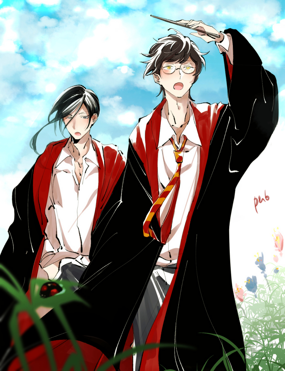 2boys black_hair black_robe cloud collar day floating_clothes floating_hair flower glasses grey_eyes harry_potter_(series) hogwarts_school_uniform holding holding_wand james_potter loose_necktie male_focus multiple_boys necktie open_mouth outdoors plant pubupu11 robe school_uniform shirt sirius_black sky striped_clothes striped_necktie wand white_shirt wing_collar wizarding_world yellow_eyes