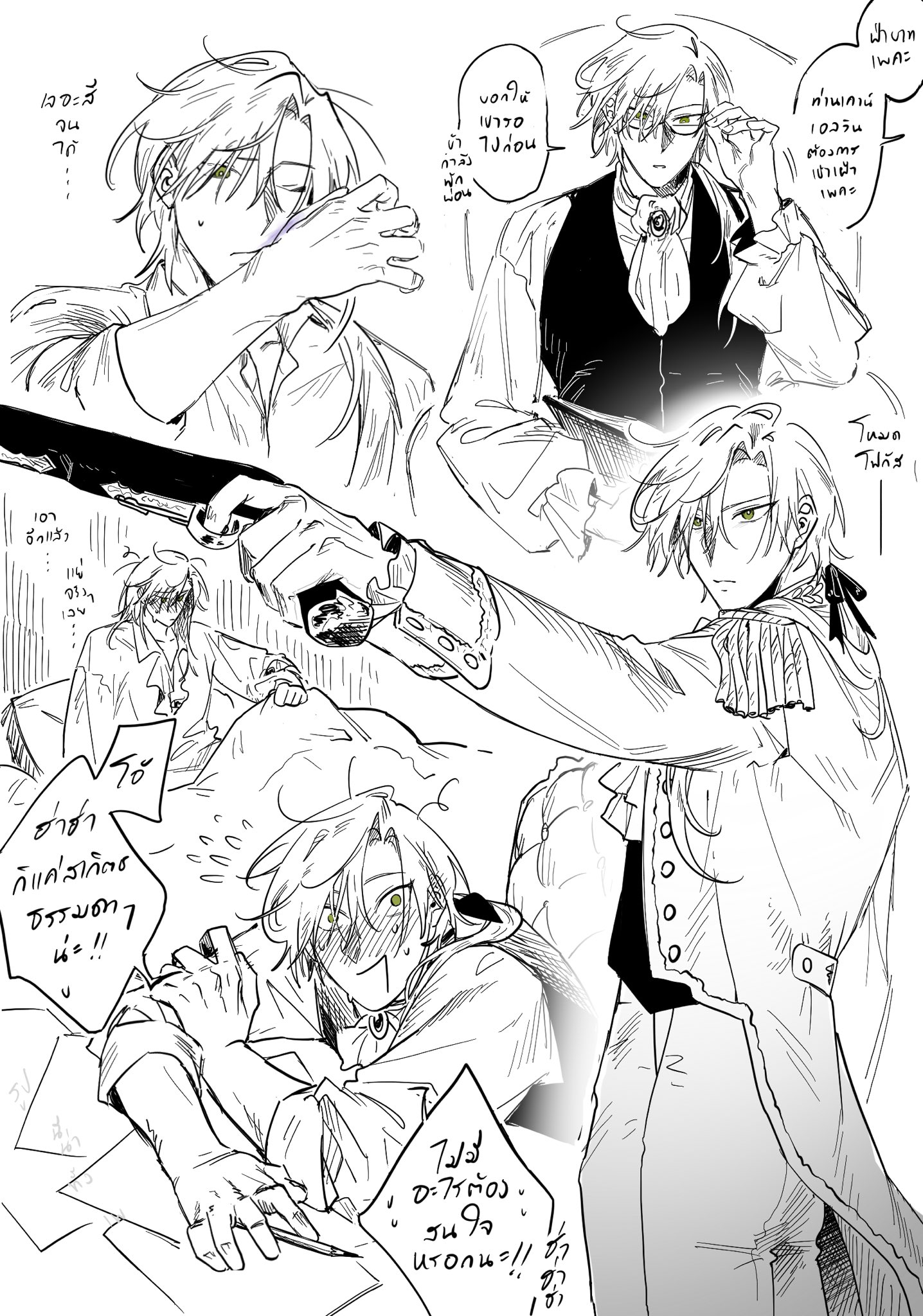 1boy adjusting_eyewear ascot blush book closed_mouth cowboy_shot epaulettes glasses green_eyes gun hair_between_eyes hand_up handgun highres holding holding_book holding_gun holding_weapon jacket long_hair long_sleeves looking_at_viewer looking_down looking_to_the_side monochrome multiple_views one_eye_closed open_clothes open_jacket open_mouth original pants paper parted_lips pencil ponytail portrait ribbon shirt simple_background sketch speech_bubble spot_color sweat thai_text translation_request under_covers unholymilk upper_body vest weapon white_background