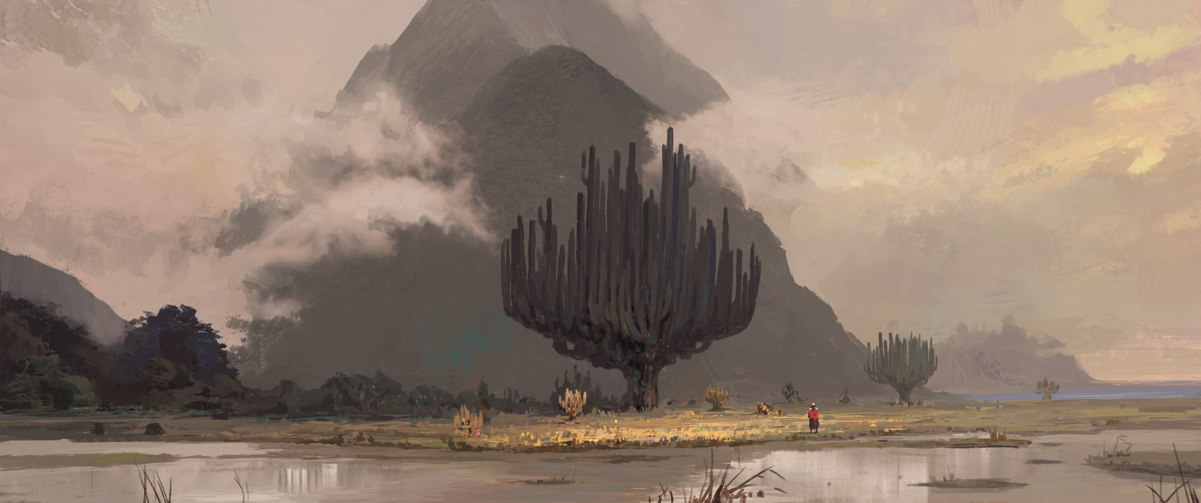 1boy absurdres cactus cape cloud day desert fog from_behind gradient_sky grass grey_sky highres lake landscape mountain original painterly red_cape scenery sky standing sunlight water yellow_sky zhongjusun