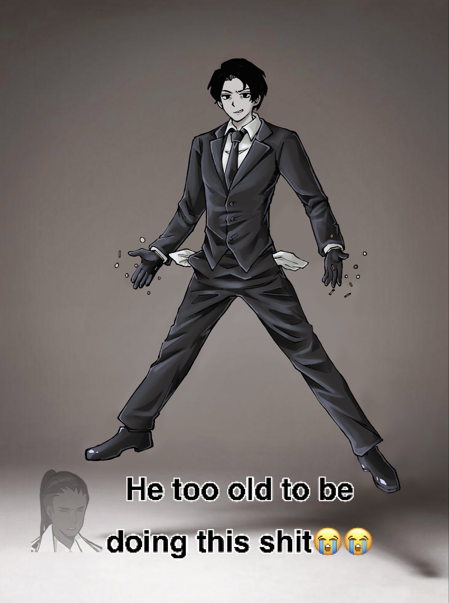 1boy black_eyes black_gloves black_hair black_necktie black_pants black_shoes black_suit coin commentary dark-skinned_male dark_skin english_commentary english_text floating formal_clothes gloves highres jacket jumping lapels layered_sleeves library_of_ruina male_focus meme necktie notched_lapels olivier_(project_moon) pants project_moon reference_request roland_(project_moon) scene_reference senpaizeto shirt shoes short_hair suit suit_jacket white_shirt