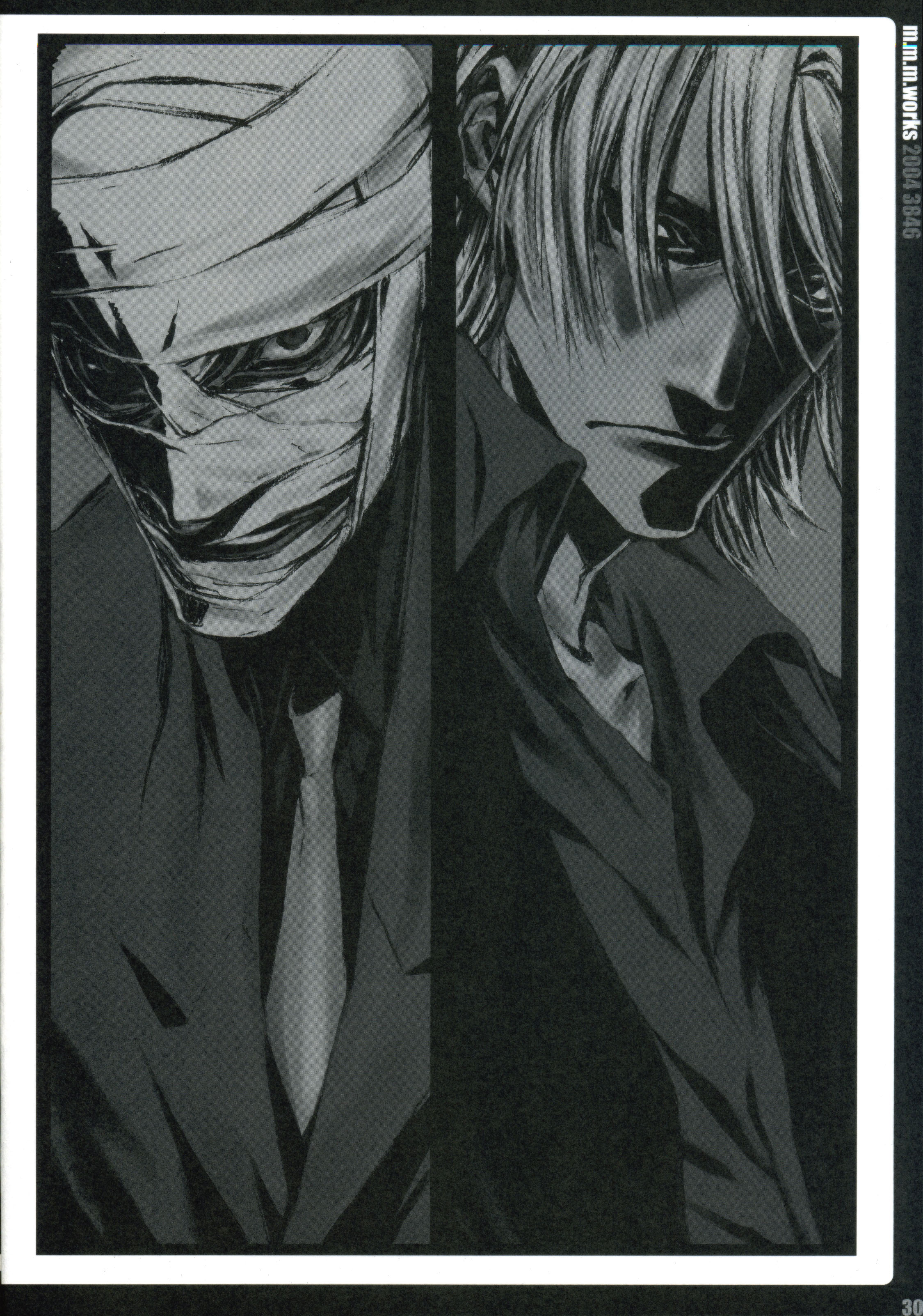 2boys absurdres bandage_on_face bandaged_head bandages brothers dante_(devil_may_cry) devil_may_cry_(series) formal_clothes frown gilver grey_necktie greyscale hair_over_one_eye highres jacket male_focus miwa_shirow monochrome multiple_boys necktie popped_collar scan shaded_face short_hair siblings suit white_hair