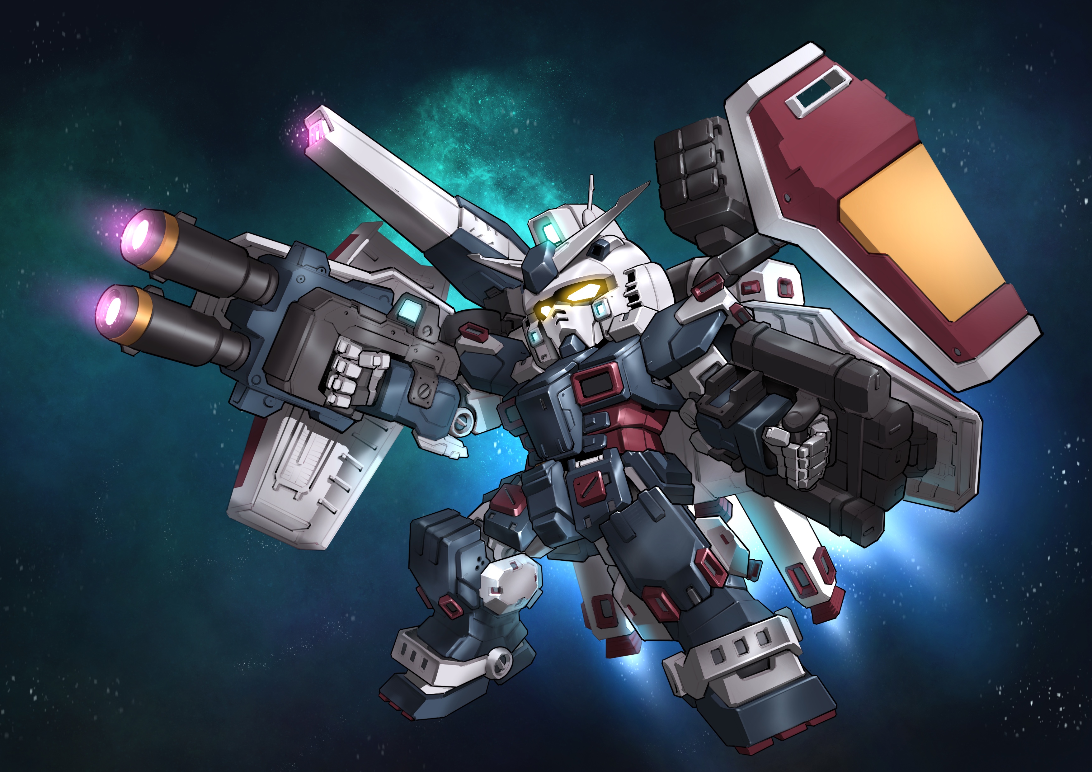 absurdres aiming beam_cannon chibi chinese_commentary commentary_request double_beam_cannon full_armor_gundam full_body glowing glowing_eyes gundam gundam_thunderbolt highres making-of_available mecha mecha_focus missile_pod mobile_suit nebula no_humans outstretched_arms radio_antenna robot science_fiction sd_gundam shield shoulder_cannon solo space star_(sky) thrusters v-fin yellow_eyes zakuma