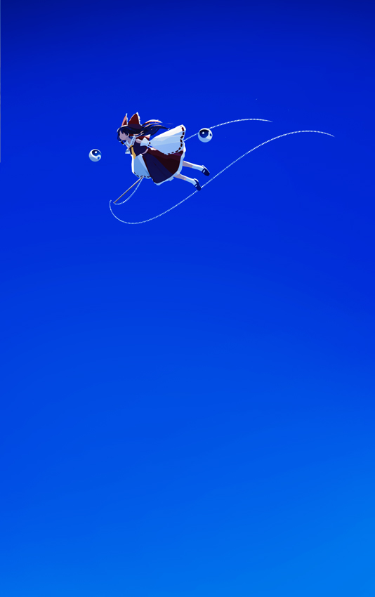 1girl ascot blue_sky bow collared_shirt commentary detached_sleeves floating floating_hair full_body gohei hair_bow hakurei_reimu haruaki_(onkai_planaria) holding holding_gohei long_hair medium_skirt orb red_bow red_shirt red_skirt shirt shoes skirt sky sleeveless sleeveless_shirt socks solo touhou white_sleeves wide_shot wide_sleeves yellow_ascot yin_yang yin_yang_orb