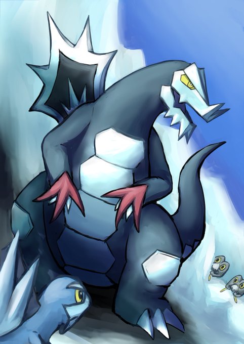 arctibax baxcalibur closed_mouth commentary_request evolutionary_line frigibax keba-saki nintendo no_humans open_mouth outdoors pokemon pokemon_(creature) pokemon_focus