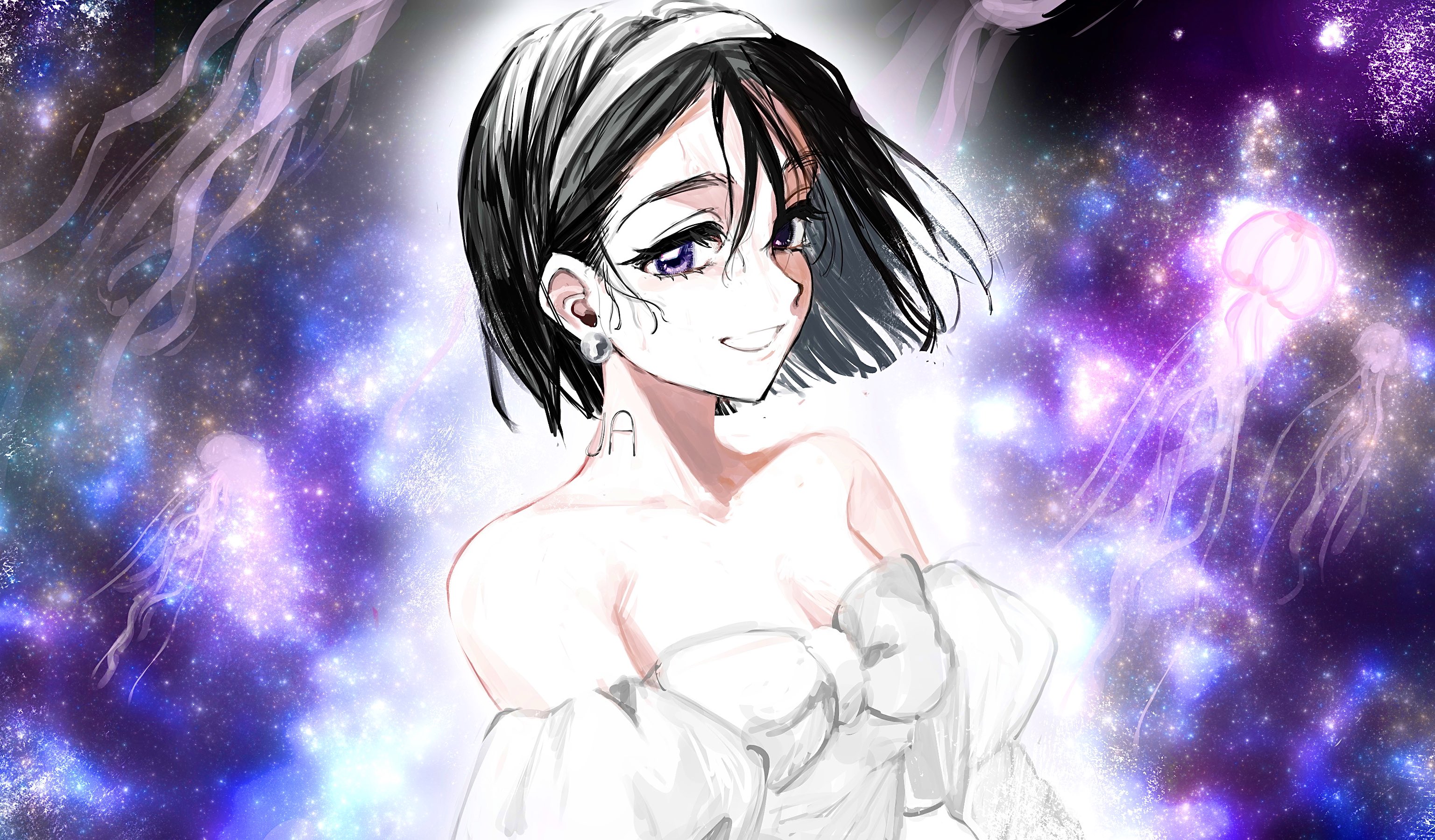 1girl alien_stage bare_shoulders black_hair bob_cut breasts commentary dress earrings hairband highres jellyfish jewelry juliet_sleeves kamonegiaaa long_sleeves looking_at_viewer neck_tattoo off-shoulder_dress off_shoulder pearl_earrings puffy_sleeves purple_eyes short_hair small_breasts smile solo space sphere_earrings star_(sky) sua_(alien_stage) tattoo white_dress white_hairband