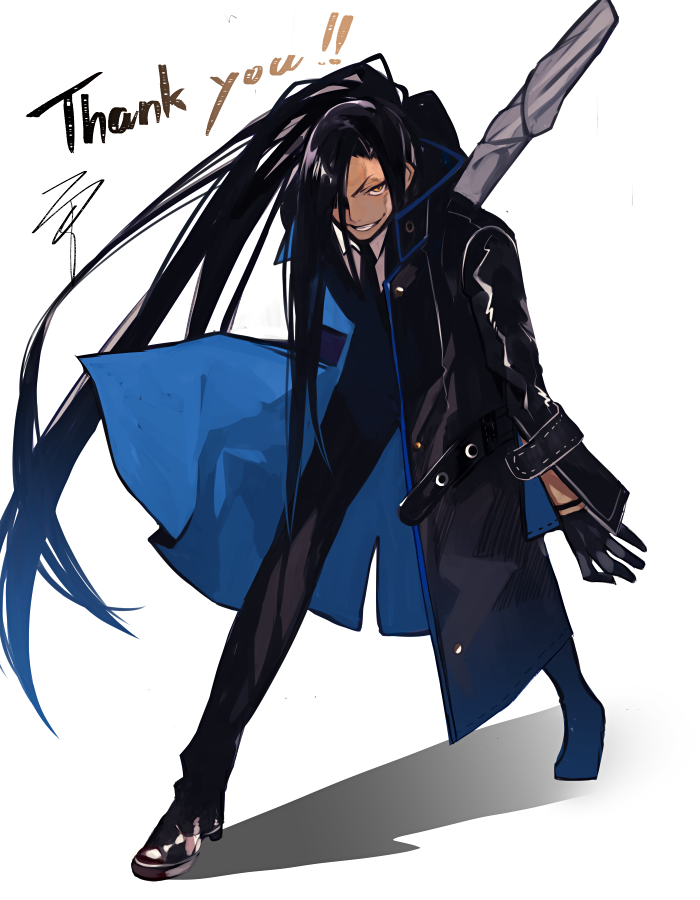 1boy belt black_hair black_necktie blue_coat blue_trim buttons coat collared_shirt commentary_request commission formal_clothes gloves grin holding holding_weapon hyakuhachi_(over3) jacket leaning_forward leather leather_jacket long_coat long_hair long_sleeves looking_at_viewer male_focus necktie original ponytail shadow shirt smile solo suit thank_you trench_coat two-sided_coat two-sided_fabric very_long_hair weapon weapon_bag white_shirt yellow_eyes