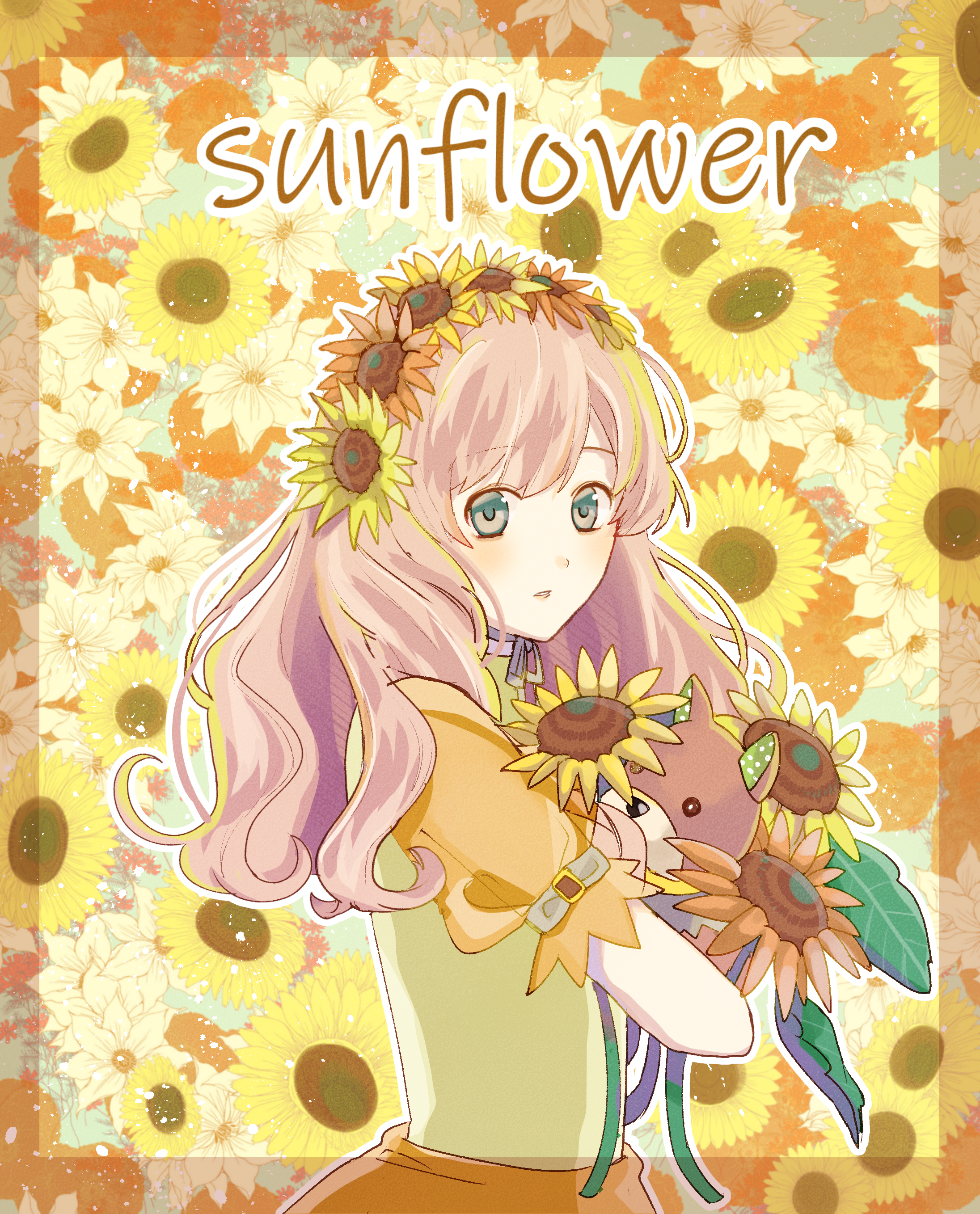 1boy absurdres blonde_hair blush commentary_request dress floral_background flower green_eyes hair_flower hair_ornament highres holding holding_stuffed_toy i-chu leaf long_hair looking_at_viewer mwi-sun-net neck_ribbon oikawa_momosuke ribbon short_sleeves solo stuffed_animal stuffed_toy sunflower sunflower_hair_ornament swept_bangs teddy_bear trap