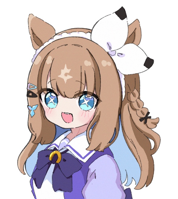 1girl :d almond_eye_(umamusume) animal_ears blue_eyes blue_hair bow braid brown_hair hair_ornament hair_ribbon hairband hairclip horse_ears long_hair multicolored_hair nozo_(hitomiz) open_mouth puffy_sleeves purple_bow purple_shirt ribbon school_uniform shirt simple_background smile solo tracen_school_uniform two-tone_hair umamusume upper_body white_background white_hairband white_ribbon