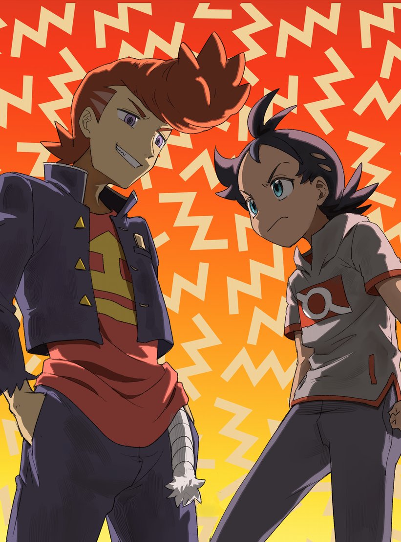 2boys black_pants blue_eyes closed_mouth commentary_request eye_contact frown goh_(pokemon) gradient_background grey_shirt hands_in_pockets hodge_(pokemon) jacket looking_at_another male_focus matsuno_opa medium_hair multiple_boys nintendo open_clothes open_jacket pants pokemon pokemon_(anime) pokemon_journeys shirt short_sleeves