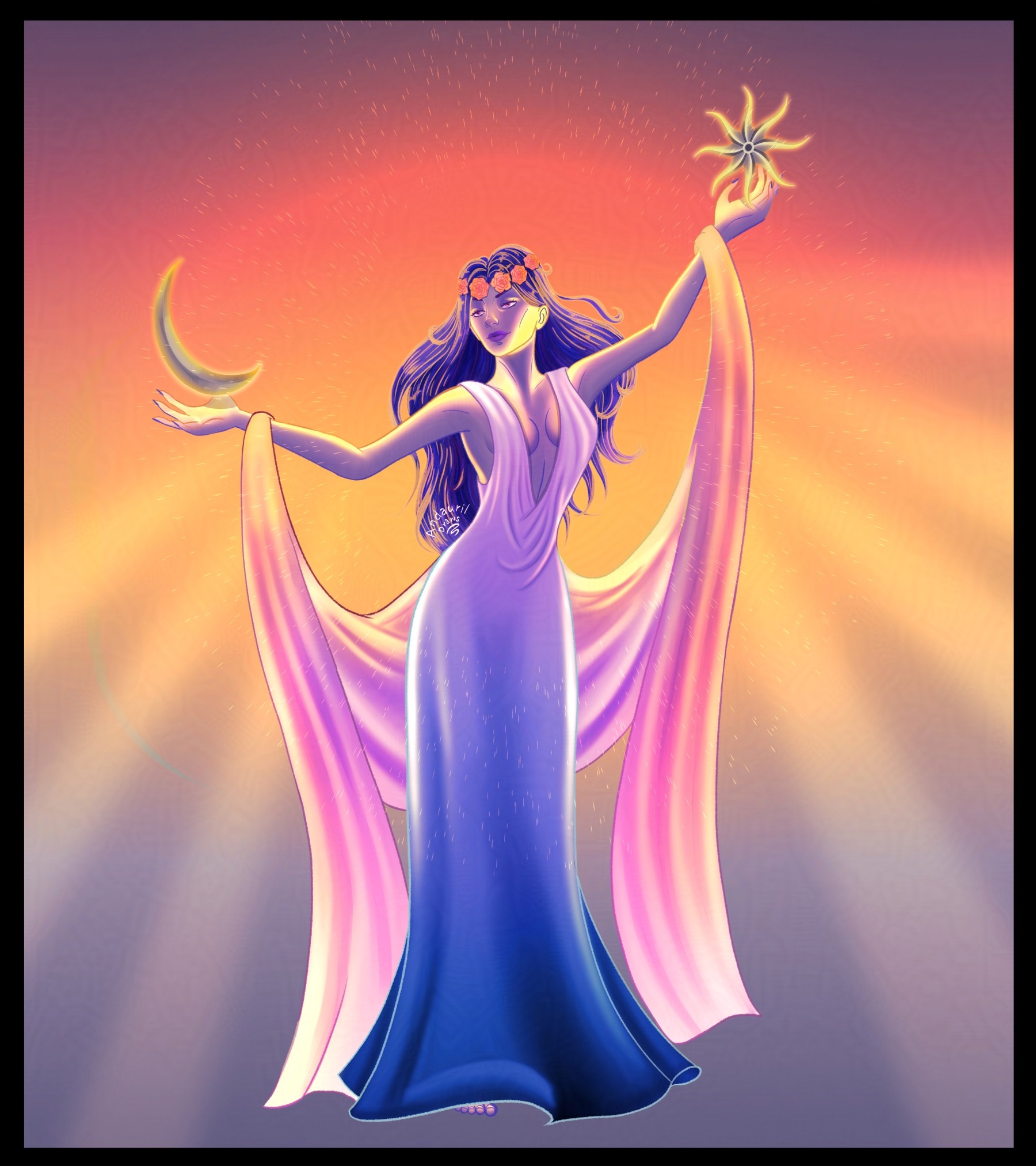 1girl andauril arm_up azura_(the_elder_scrolls) barefoot black_hair blue_dress colored_skin commentary crescent dress english_commentary flower full_body glowing gradient_background gradient_clothes grey_background grey_skin head_wreath highres holding holding_moon holding_star long_hair orange_background pink_ribbon purple_dress red_background red_eyes red_flower ribbon sleeveless solo standing star_(symbol) the_elder_scrolls the_elder_scrolls_iii:_morrowind yellow_background
