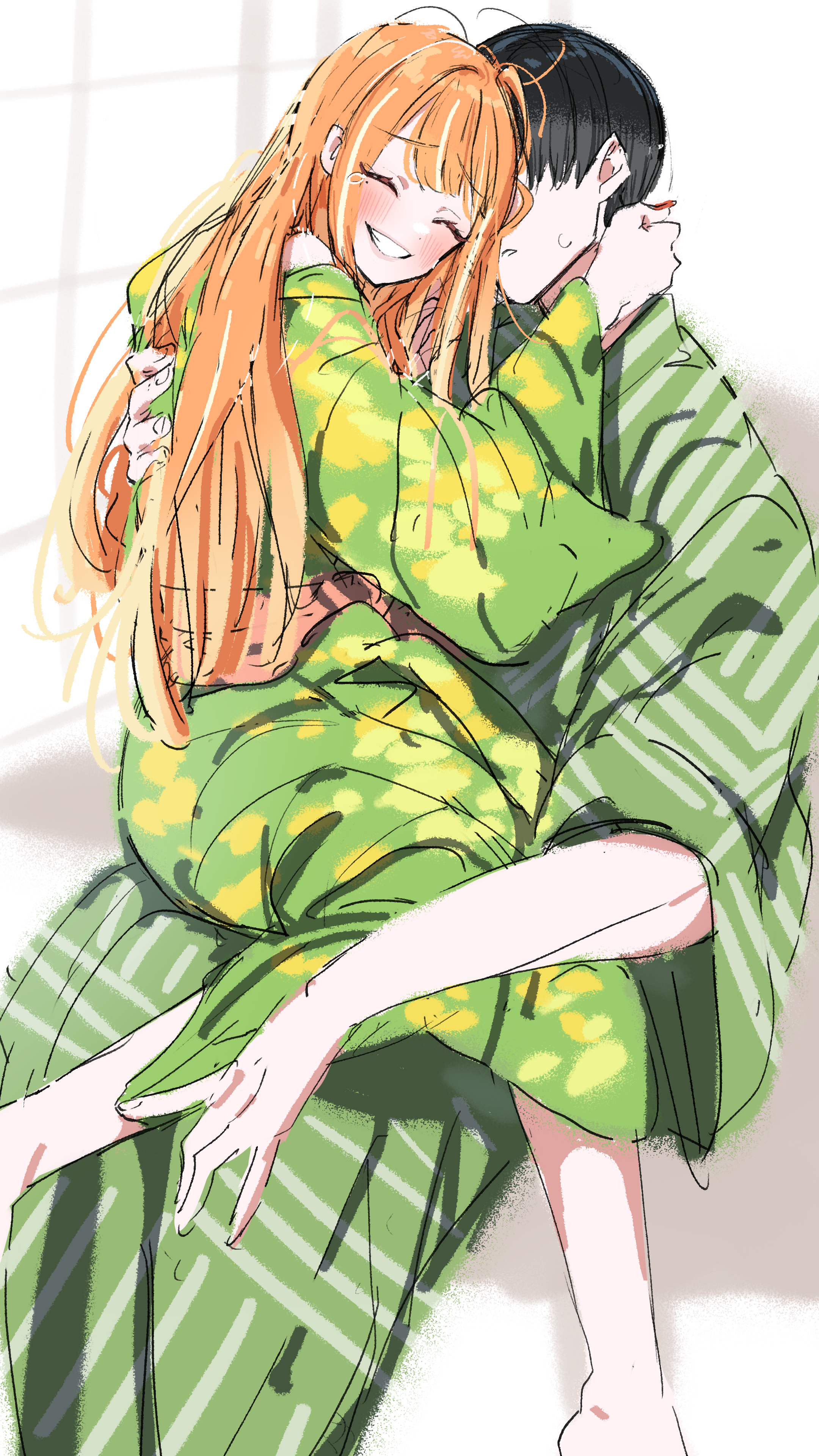 1boy 1girl ^_^ absurdres alternate_costume barefoot blush closed_eyes commentary gakuen_idolmaster green_kimono grin hetero highres hug idolmaster indoors japanese_clothes kasasagi_(futagodori888) kimono long_hair orange_hair producer_(idolmaster) shiun_sumika sitting sitting_on_person smile straight_hair tears very_long_hair