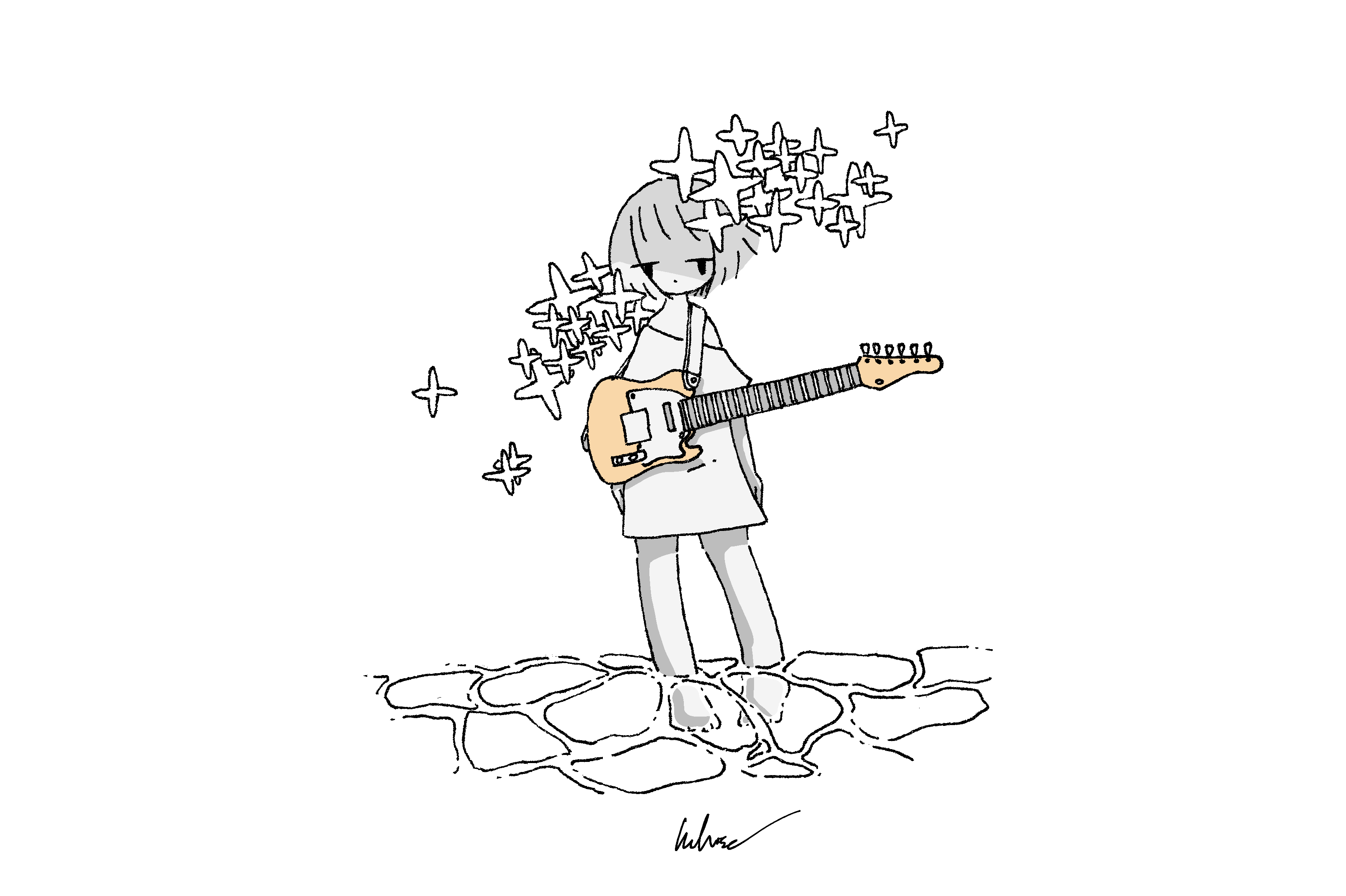1girl absurdres arms_at_sides barefoot commentary electric_guitar greyscale guitar highres instrument kaduise monochrome original oversized_clothes oversized_shirt shirt short_hair signature solo sparkle spot_color wading water