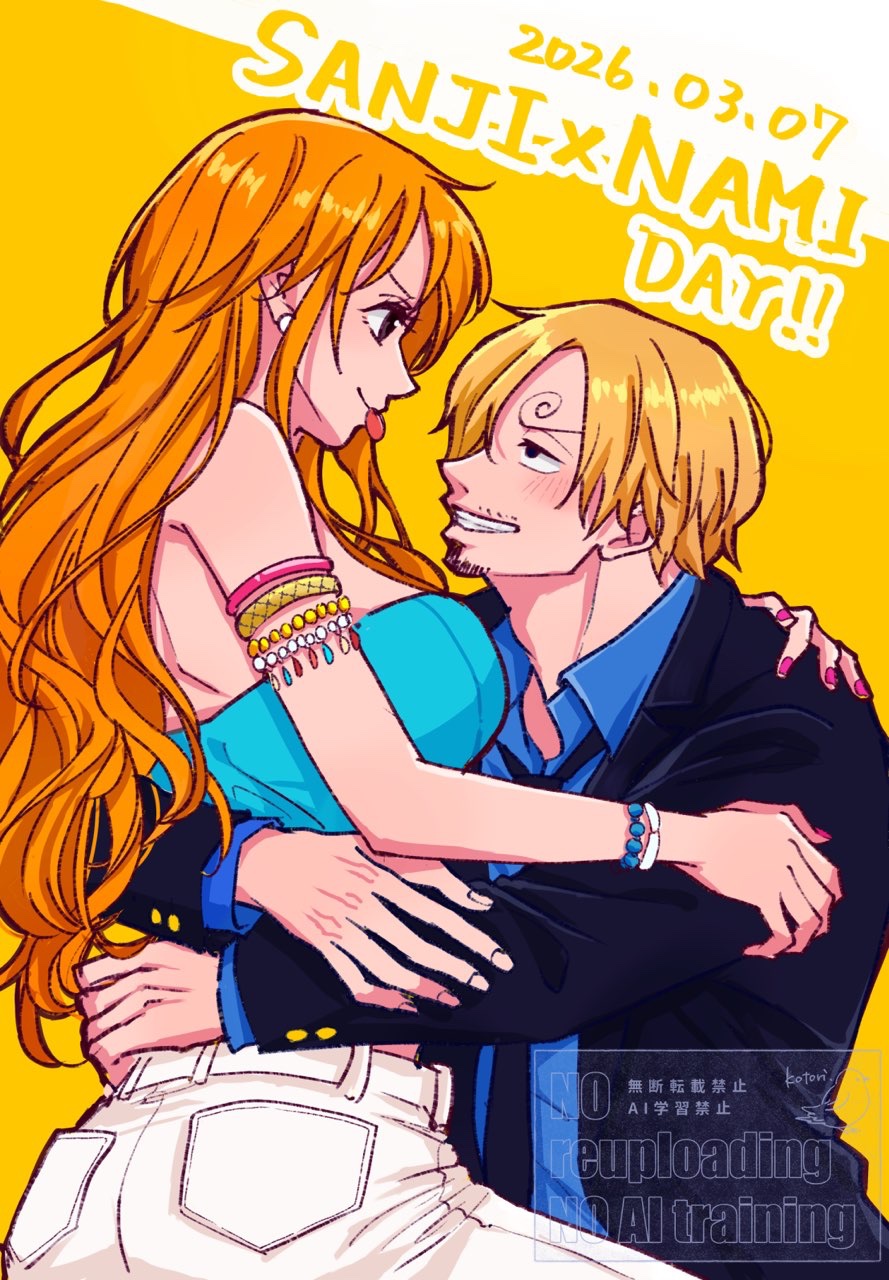 1boy 1girl black_necktie black_suit blonde_hair blue_shirt bracelet collared_shirt commentary_request curly_eyebrows dated earrings eyelashes facial_hair formal_clothes goatee highres hug jewelry ko_tori0 long_hair mustache nami_(one_piece) necktie one_piece pants pearl_earrings pink_nails sanji_(one_piece) shirt short_hair smile suit tongue tongue_out white_pants