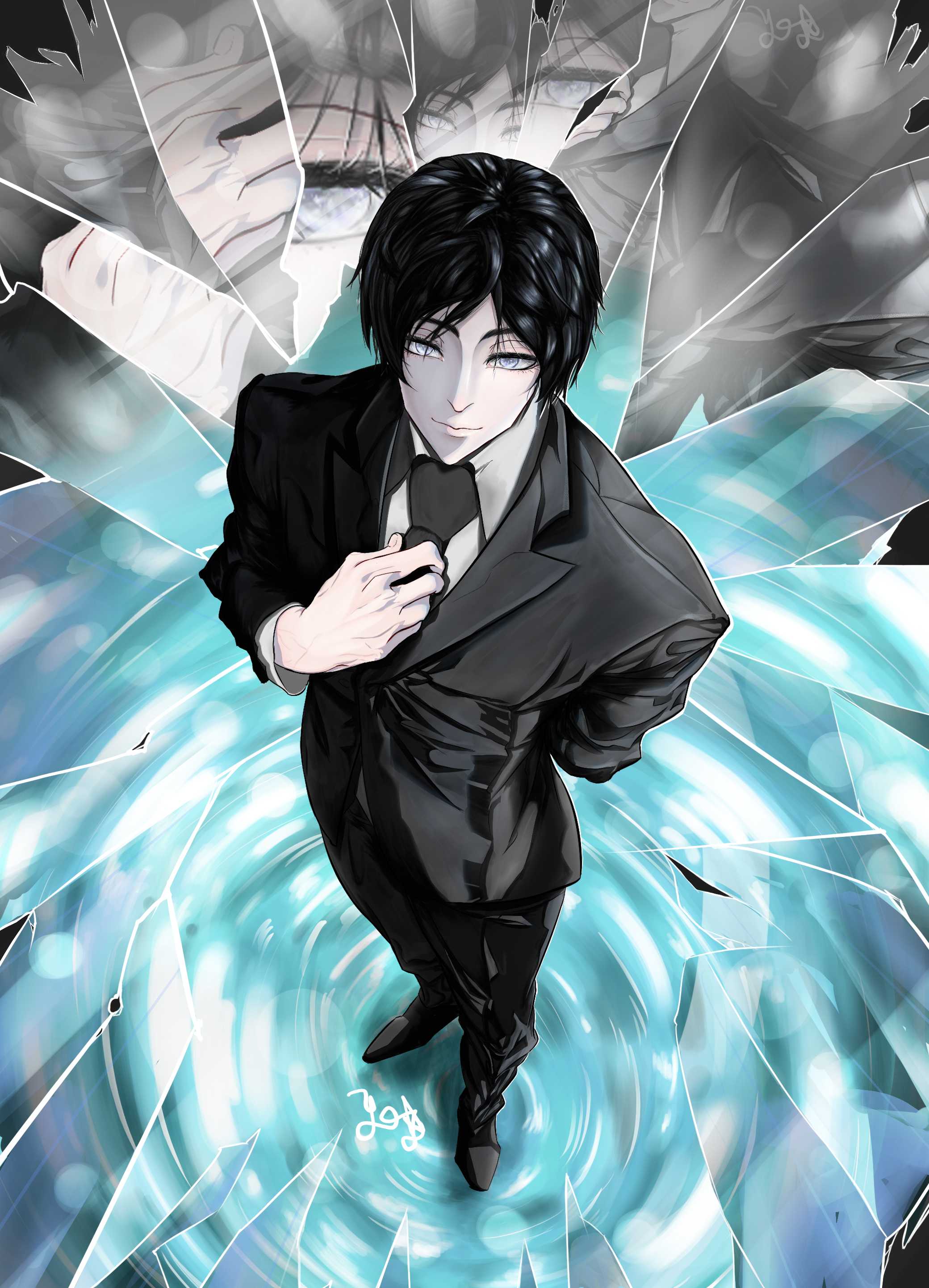 1boy absurdres adjusting_clothes adjusting_necktie arm_behind_back black_jacket black_necktie black_suit collared_shirt commentary english_commentary formal_clothes from_above full_body highres jacket lun5rtic male_focus mordret_(shadow_slave) necktie shadow_slave shirt solo suit white_shirt