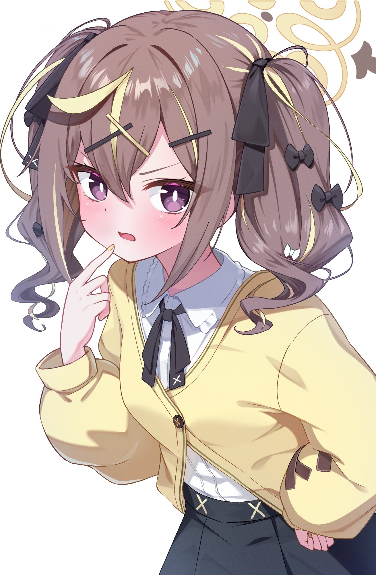 >:( 1girl black_bow black_ribbon black_skirt blonde_streaks blue_archive blush bow bright_pupils cardigan closed_mouth collared_shirt commentary_request cowboy_shot eyelashes finger_to_mouth frown hair_bow hair_ornament hair_ribbon hairclip halo hand_on_own_hip hand_up highres index_finger_raised looking_at_viewer multicolored_hair neck_ribbon rena_(blue_archive) revision ribbon shinori_(efvbji6264) shirt sidelocks simple_background skirt solo streaked_hair tsurime twintails two-tone_hair v-shaped_eyebrows white_background white_pupils white_shirt x_hair_ornament yellow_cardigan yellow_halo