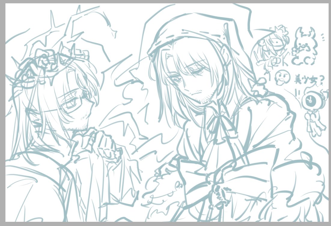 ! 1other 2boys absurdres alternate_costume angry arthropod_limbs ascot bags_under_eyes beads beard_stubble bell blanket blue_theme bow bowtie capelet chain chest_bow chibi chibi_inset christmas christmas_nightmare_(e.g.o) clock closed_mouth coat collared_dress collared_shirt constricted_pupils crazy_eyes crown_of_thorns cyclops dante_(limbus_company) dark dngrumauma dress dual_persona e.g.o_(project_moon) emoji expressionless eyes_visible_through_hair facial_hair fire flower flower_wreath formal_clothes frown fur-trimmed_shawl fur-trimmed_slippers fur_collar fur_trim garden_of_thorns_(e.g.o) glasses gloves gregor_(project_moon) hair_between_eyes hair_flower hair_intakes hair_ornament hair_vines hairband hat head_wreath highres lapels limbus_company lineart long_hair long_sleeves looking_at_another looking_down looking_to_the_side male_bride male_focus multiple_boys neck_ribbon necktie nightcap no_mouth notched_lapels notice_lines object_head official_alternate_costume one-eyed one_eye_closed pajamas pants parted_bangs photoshop_(medium) plaid_blanket plaid_bow plaid_clothes plaid_shawl plant project_moon prosthetic_head ribbon ribbon-trimmed_hat sash semi-rimless_eyewear shawl shirt shoulder_sash simple_background single_eye sketch stubble stuffed_animal stuffed_reindeer stuffed_toy tassel thorns torn_capelet torn_clothes turtleneck turtleneck_dress under-rim_eyewear unfinished upper_body vines waist_sash white_background wide-eyed