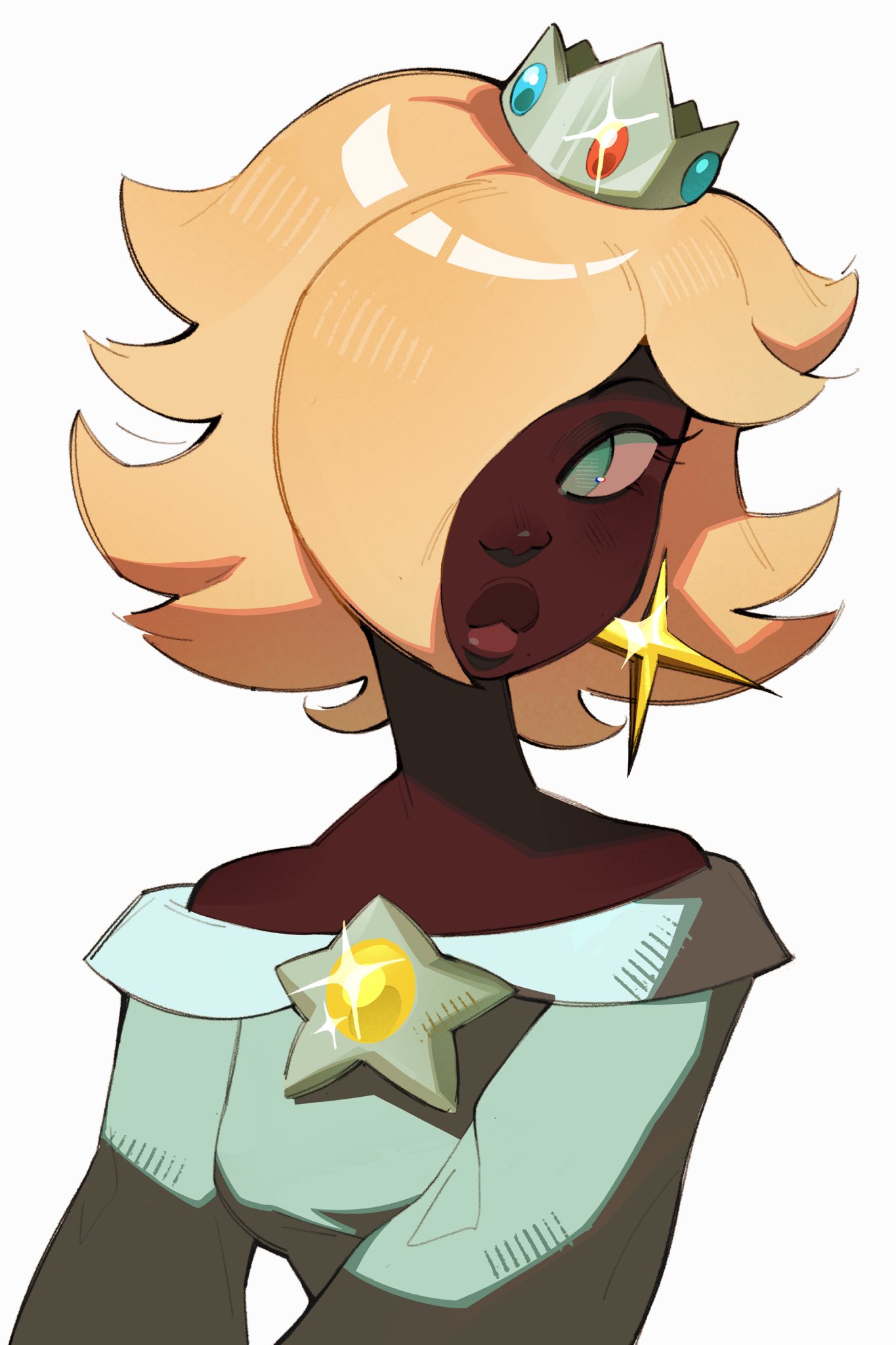 1girl alternate_hairstyle alternate_skin_color bare_shoulders blue_dress blue_eyes commentary crown dark-skinned_female dark_skin dress earrings facetnine glint hair_over_one_eye highres jewelry long_bangs looking_to_the_side mario_(series) mole mole_under_mouth nintendo off-shoulder_dress off_shoulder one_eye_covered portrait rosalina short_hair simple_background solo super_mario_galaxy thick_lips white_background