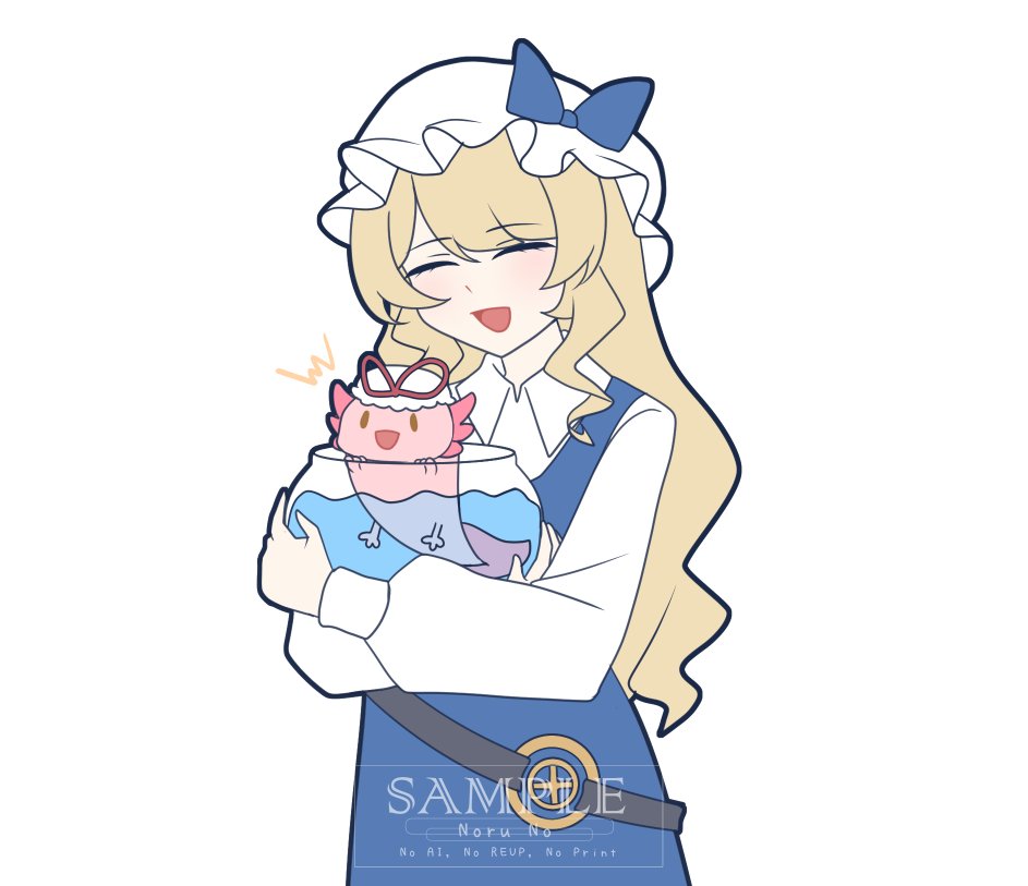 1girl animal animalization axolotl belt black_belt blonde_hair blue_bow blue_dress blush bow closed_eyes clothed_animal collared_shirt commentary dress english_commentary facing_viewer fishbowl hat hat_bow hat_ribbon long_hair long_sleeves looking_at_viewer mob_cap no_noru open_mouth red_ribbon ribbon sample_watermark shirt smile touhou watatsuki_no_toyohime watermark white_hat white_shirt yakumo_yukari yakumo_yukari_(axolotl)
