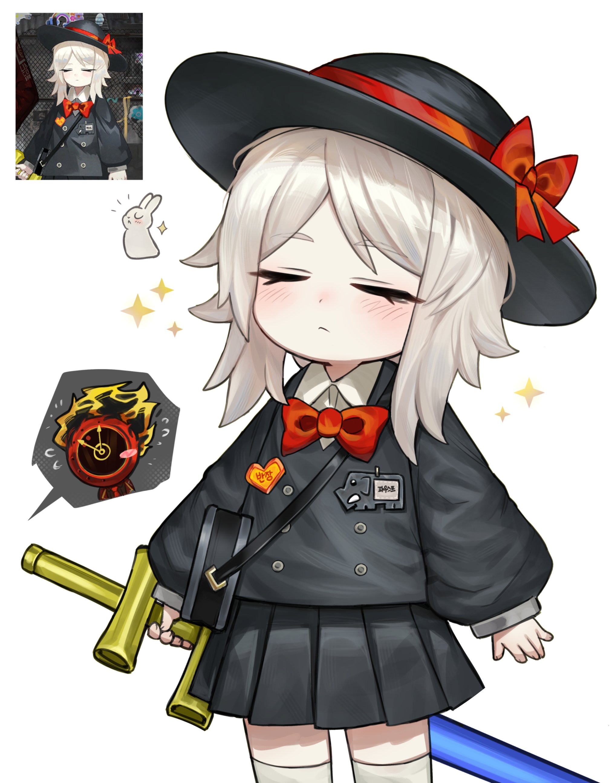 1girl 1mingk absurdres aged_down black_hat black_shirt black_skirt bow child closed_eyes closed_mouth commentary dante_(limbus_company) faust_(project_moon) flying_sweatdrops game_screenshot_inset hat hat_bow highres limbus_company limbus_kindergarten_uniform long_hair multiple_views pleated_skirt project_moon red_bow screenshot_inset shirt skirt sparkle white_background white_hair