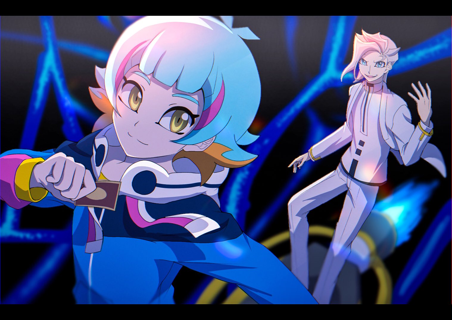 2boys alternate_form antenna_hair atltax_00 black_background blonde_hair blue_coat blue_hair blurry blurry_background bowl_cut brown_eyes card coat colored_tips facing_another grin hand_up holding holding_card hoverboard letterboxed looking_at_another looking_to_the_side male_focus midair multicolored_hair multiple_boys open_clothes open_coat outdoors pants parted_hair roboppi shirt smile space spectre_(yu-gi-oh!) white_coat white_hood white_pants white_shirt yu-gi-oh! yu-gi-oh!_vrains