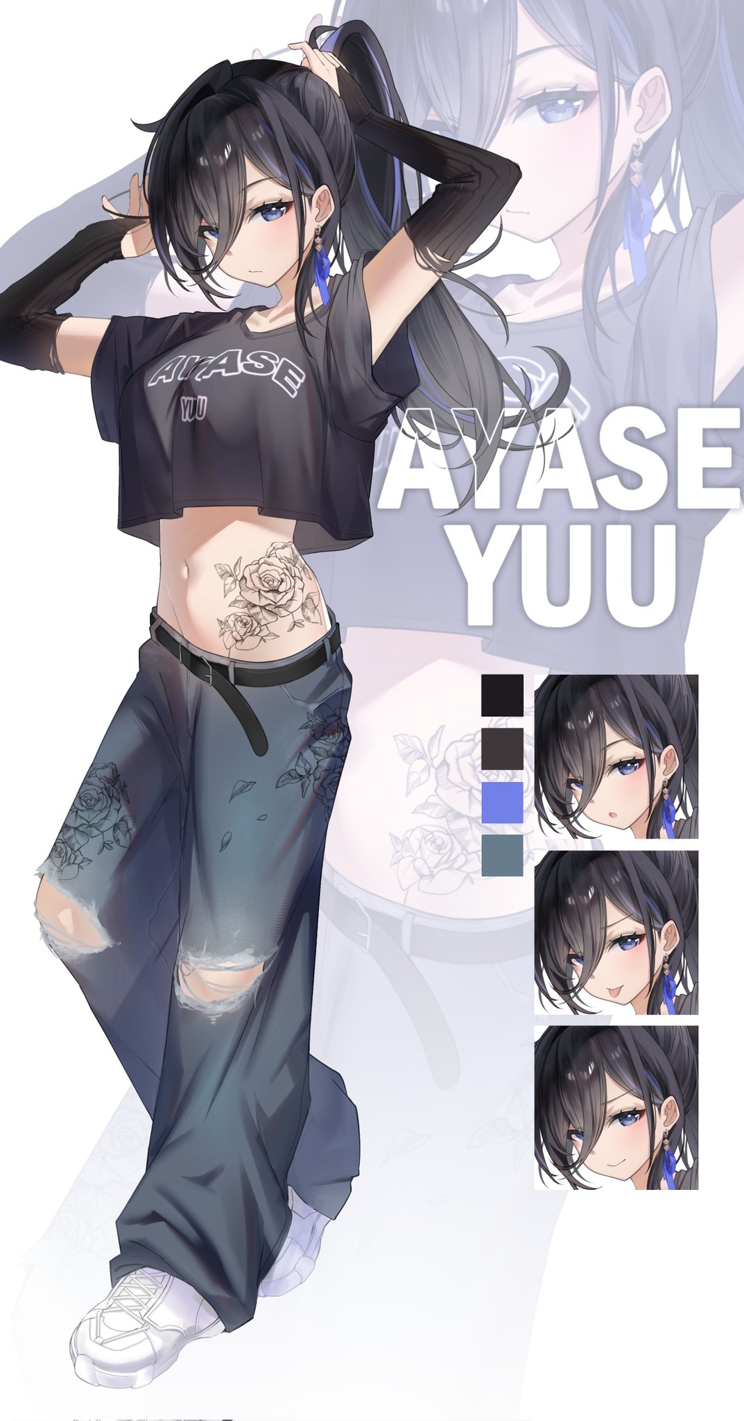 1girl ayase_yuu baggy_pants belt black_hair blue_eyes crop_top denim fingerless_gloves gloves jeans midriff navel pants phase_connect phase_connect_jp ponytail shoes sneakers sobbi11 stomach stomach_tattoo tagme tattoo torn_clothes torn_jeans torn_pants virtual_youtuber white_shoes