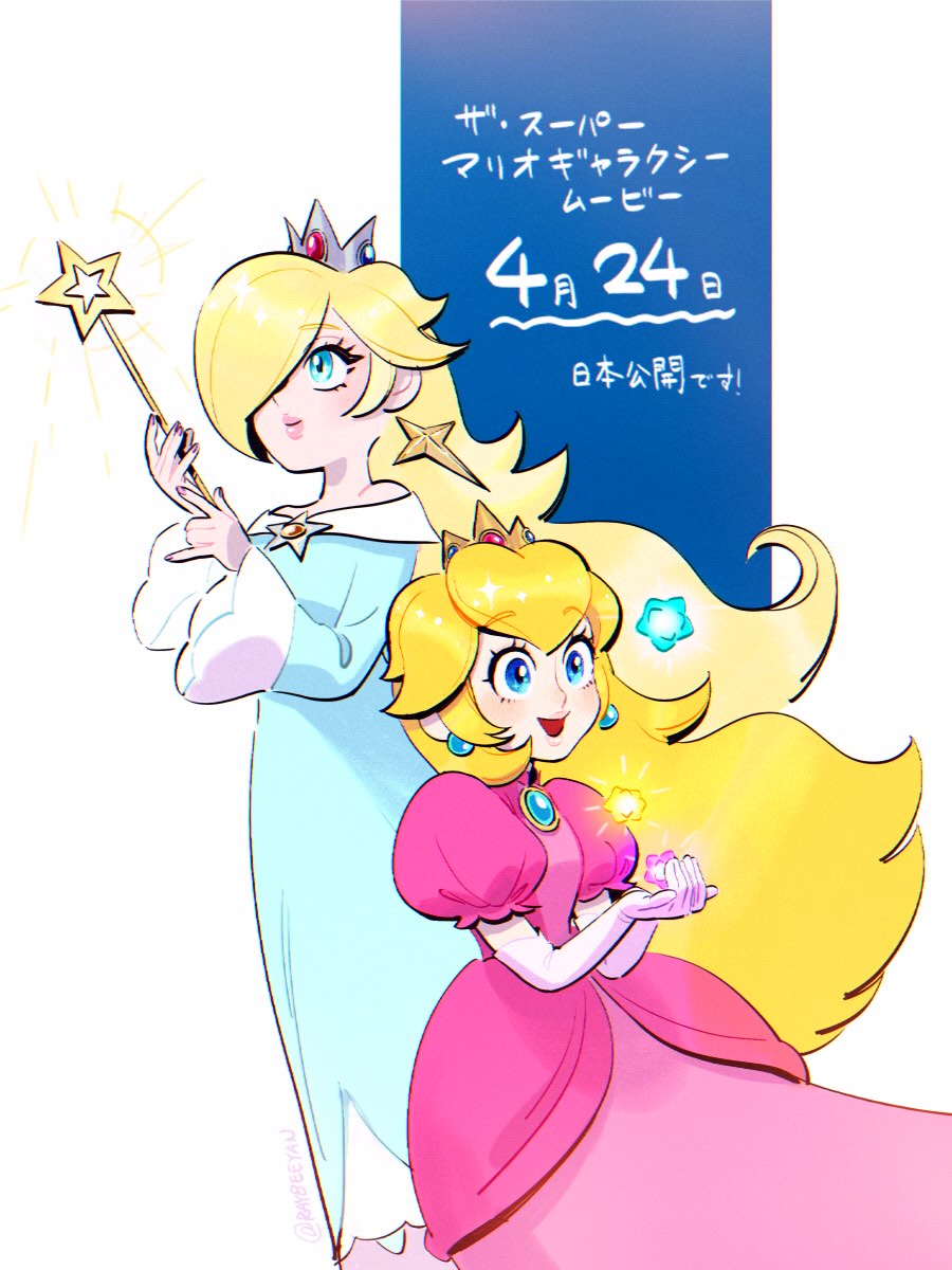 2girls :d artist_name blonde_hair blue_dress blue_eyes brooch closed_mouth commentary crown dress earrings elbow_gloves english_commentary eyelashes gloves hair_over_one_eye highres holding holding_wand jewelry long_hair long_sleeves mario_(series) mixed-language_commentary multiple_girls nintendo off-shoulder_dress off_shoulder open_mouth pink_dress princess_peach puffy_short_sleeves puffy_sleeves purple_nails rosalina shibeeyan short_sleeves simple_background smile star_(symbol) star_bit star_brooch star_earrings translation_request very_long_hair wand white_gloves