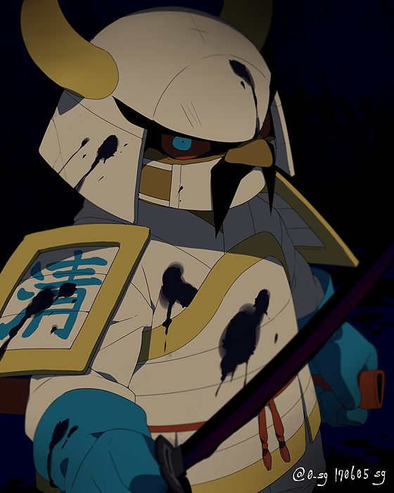 1boy araimashou armor blue_eyes blue_gloves colored_sclera commentary_request facial_hair fake_horns gloves helmet holding holding_sheath holding_sword holding_weapon horned_helmet horns japanese_armor katana male_focus mustache red_sclera sg_(suuchan) sheath solo sword twitter_username weapon youkai_(youkai_watch) youkai_watch youkai_watch_2