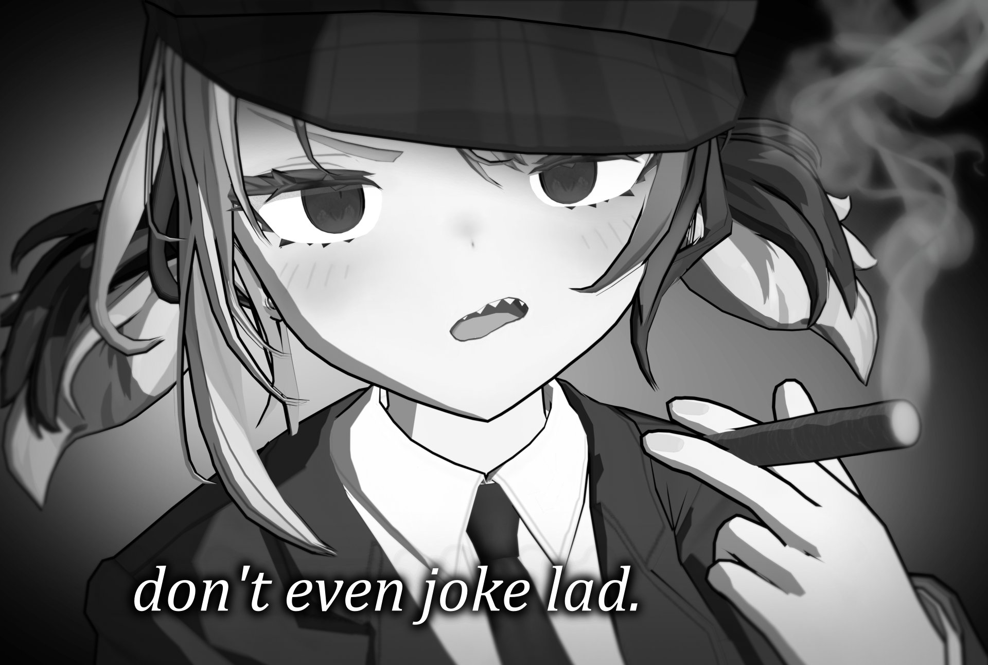 1girl cigar coat commentary dress_shirt english_commentary gigi_murin gradient_background greyscale hat highres holding holding_cigar hololive hololive_english itshollu monochrome multicolored_hair necktie newsboy_cap overcoat radial_gradient_background sharp_teeth shirt smoke smoke_trail split-color_hair teeth two-tone_hair virtual_youtuber