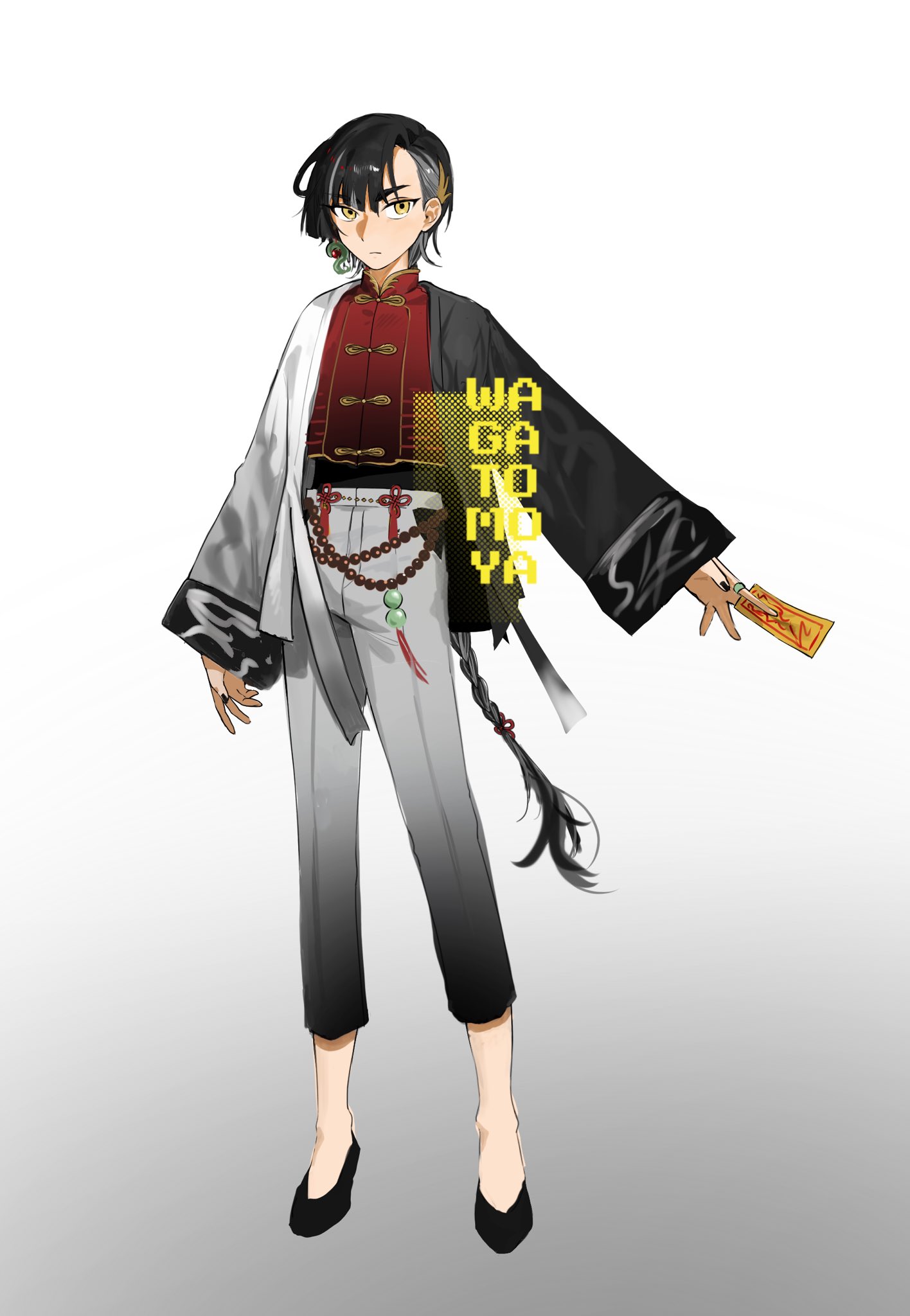 1boy adoptable artist_name black_sleeves blonde_streaks braid braided_ponytail chinese_knot commentary_request earrings full_body gradient_background gradient_pants grey_background grey_pants grey_robe grey_streaks highres jewelry long_hair looking_at_viewer multicolored_hair original pants red_shirt ring robe shirt single_earring standing streaked_hair tassel thai_commentary two-tone_robe unholymilk very_long_hair white_robe wide_sleeves yellow_eyes