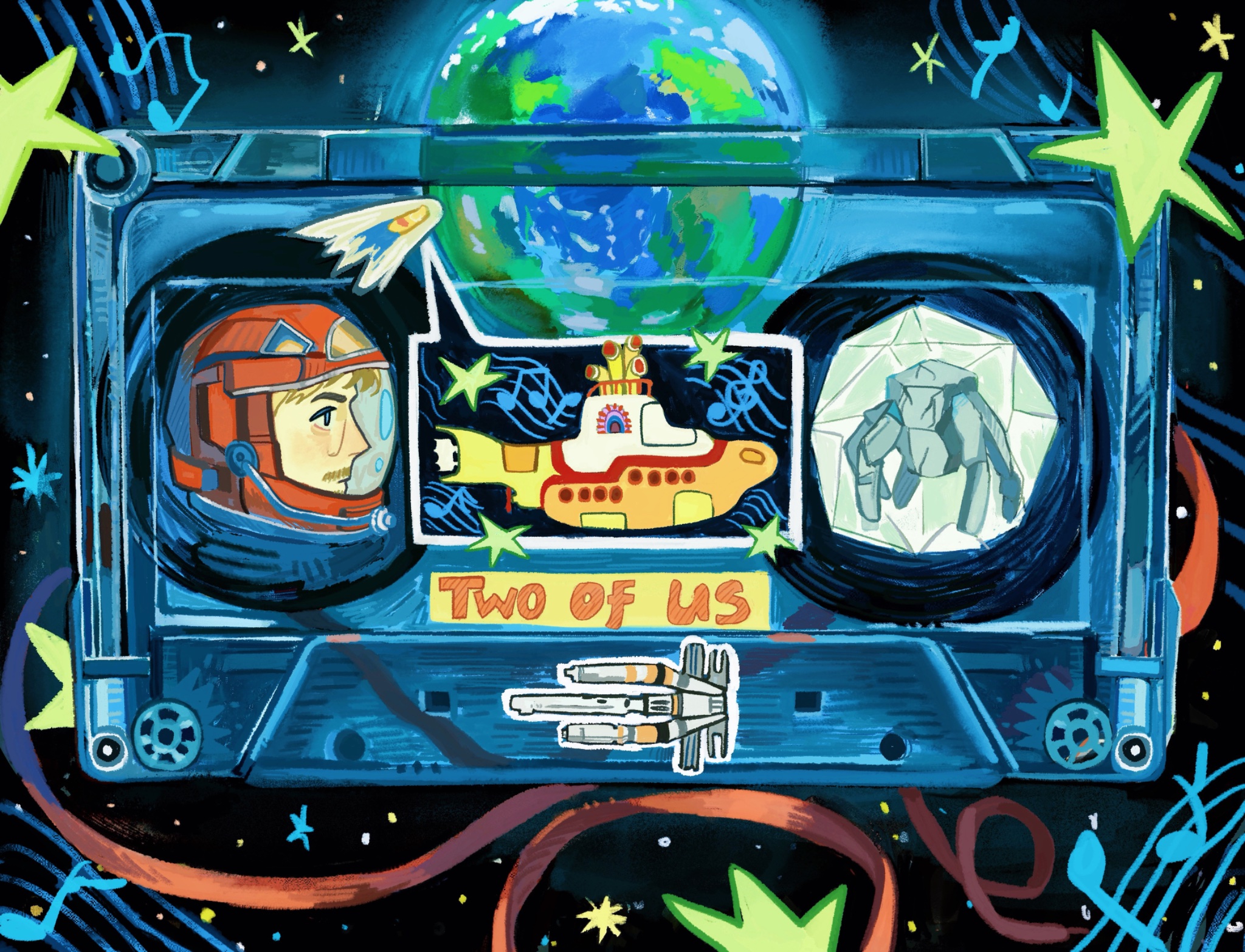 1boy 1other alien astronaut axlhj0422 beard beard_stubble cassette_player cassette_tape commentary english_commentary facial_hair galaxy highres messy_hair project_hail_mary rocky_(project_hail_mary) ryland_grace scene_fashion spacecraft spacesuit stubble