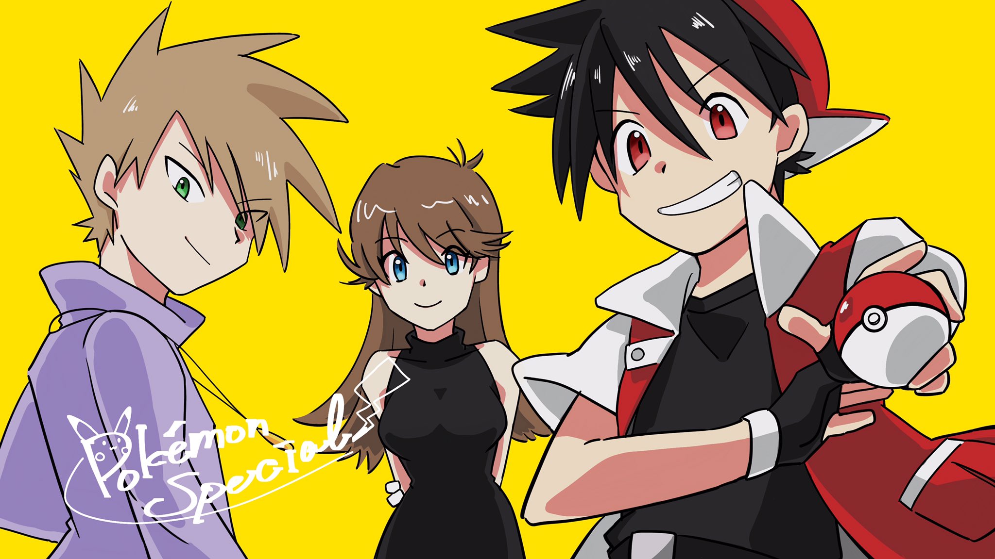 backwards_hat belt black_belt black_gloves black_hair black_shirt blue_eyes blue_oak breasts brown_hair closed_mouth commentary_request fingerless_gloves gloves green_(pokemon) green_eyes grin hat highres holding holding_poke_ball jacket jewelry long_hair looking_at_viewer necklace nintendo poke_ball pokemon pokemon_adventures pokenasi purple_shirt red_(pokemon) red_eyes red_hat red_jacket shirt short_hair simple_background sleeveless sleeveless_turtleneck smile spiked_hair teeth turtleneck upper_body yellow_background