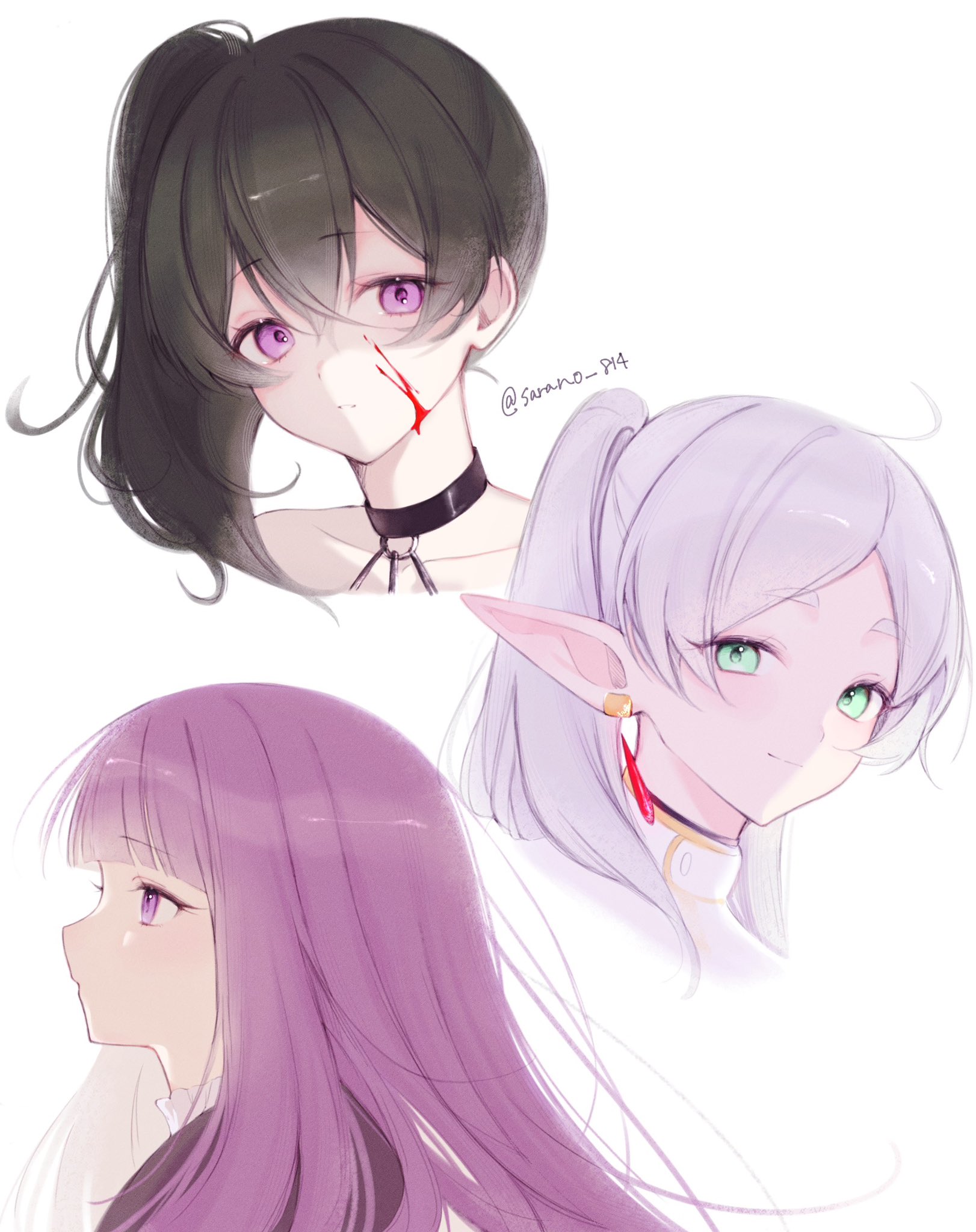 3girls black_choker blood blood_on_face choker closed_mouth earrings elf fern_(sousou_no_frieren) frieren green_eyes green_hair highres jewelry long_hair multiple_girls pointy_ears ponytail purple_eyes purple_hair sarano_814 signature simple_background smile sousou_no_frieren teardrop_earrings twintails ubel_(sousou_no_frieren) white_background white_hair