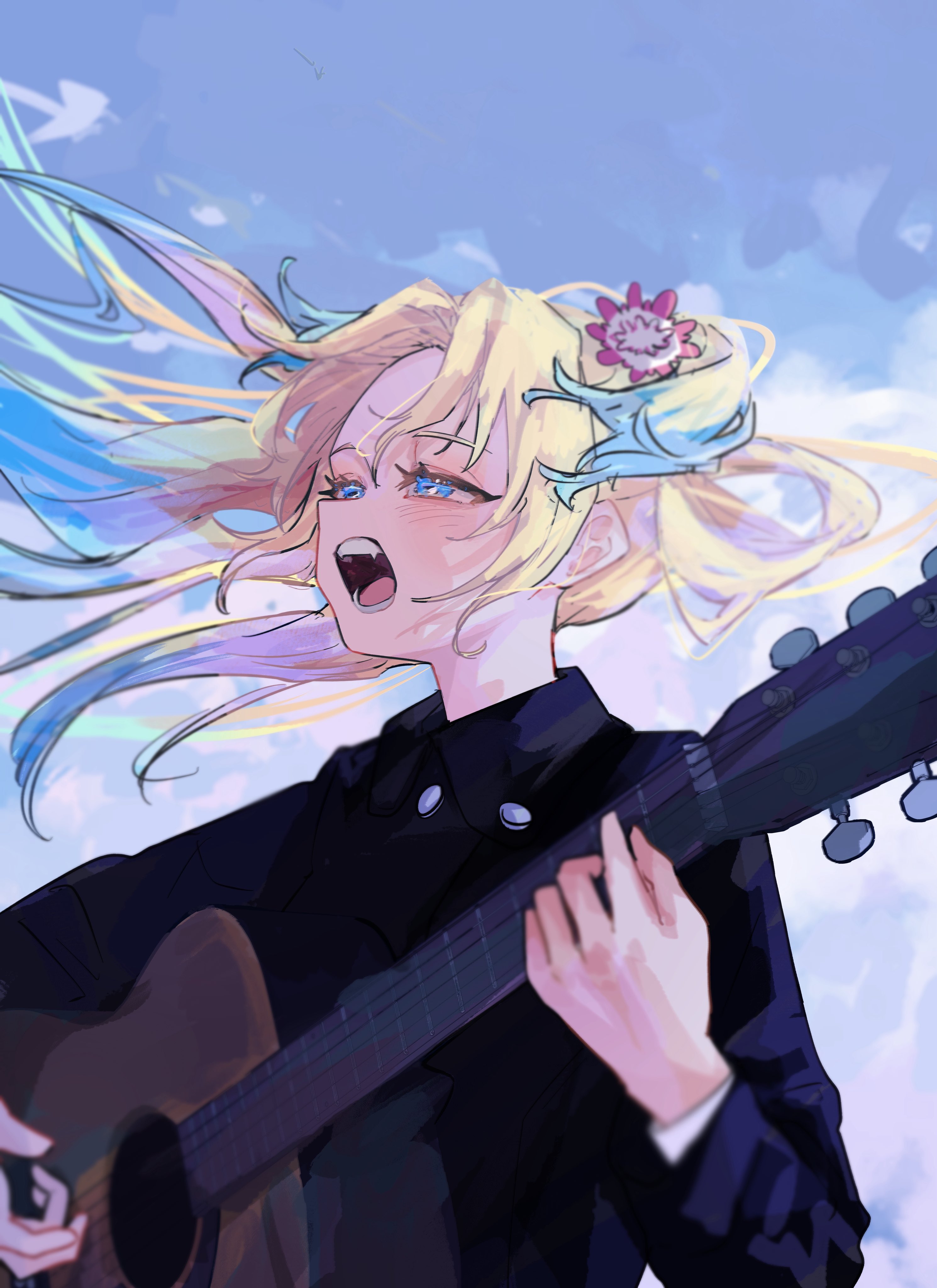 1girl absurdres acoustic_guitar black_coat blonde_hair blue_eyes blue_hair blue_sky cloud coat collared_coat commentary_request curtained_hair day echoes_beyond_(love_live!) floating_hair flower gradient_hair guitar hair_flower hair_ornament hasu_no_sora_school_uniform highres instrument jin_(oihlf) link!_like!_love_live! long_sleeves love_live! multicolored_hair music open_mouth osawa_rurino outdoors parted_bangs pink_flower playing_guitar playing_instrument school_uniform singing sky solo teeth upper_body virtual_youtuber
