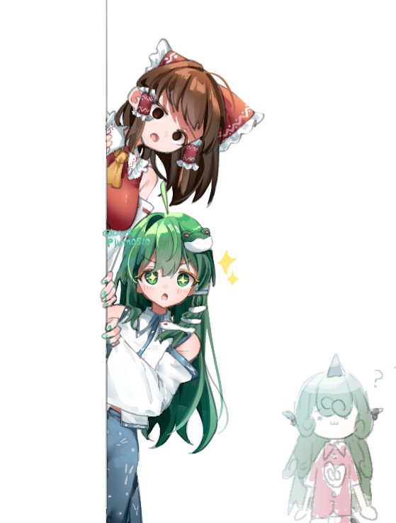 +_+ 3girls ? ascot blue_skirt bow brown_hair cloud_print curly_hair detached_sleeves frilled_bow frilled_hair_tubes frills frog_hair_ornament green_eyes green_hair hair_bow hair_ornament hair_tubes hakurei_reimu horns kariyushi_shirt kochiya_sanae komainu_girl komano_aunn long_hair looking_at_viewer loveplum0510 multiple_girls red_bow red_shirt ribbon-trimmed_sleeves ribbon_trim shirt single_hair_tube single_horn skirt snake_hair_ornament touhou yellow_ascot
