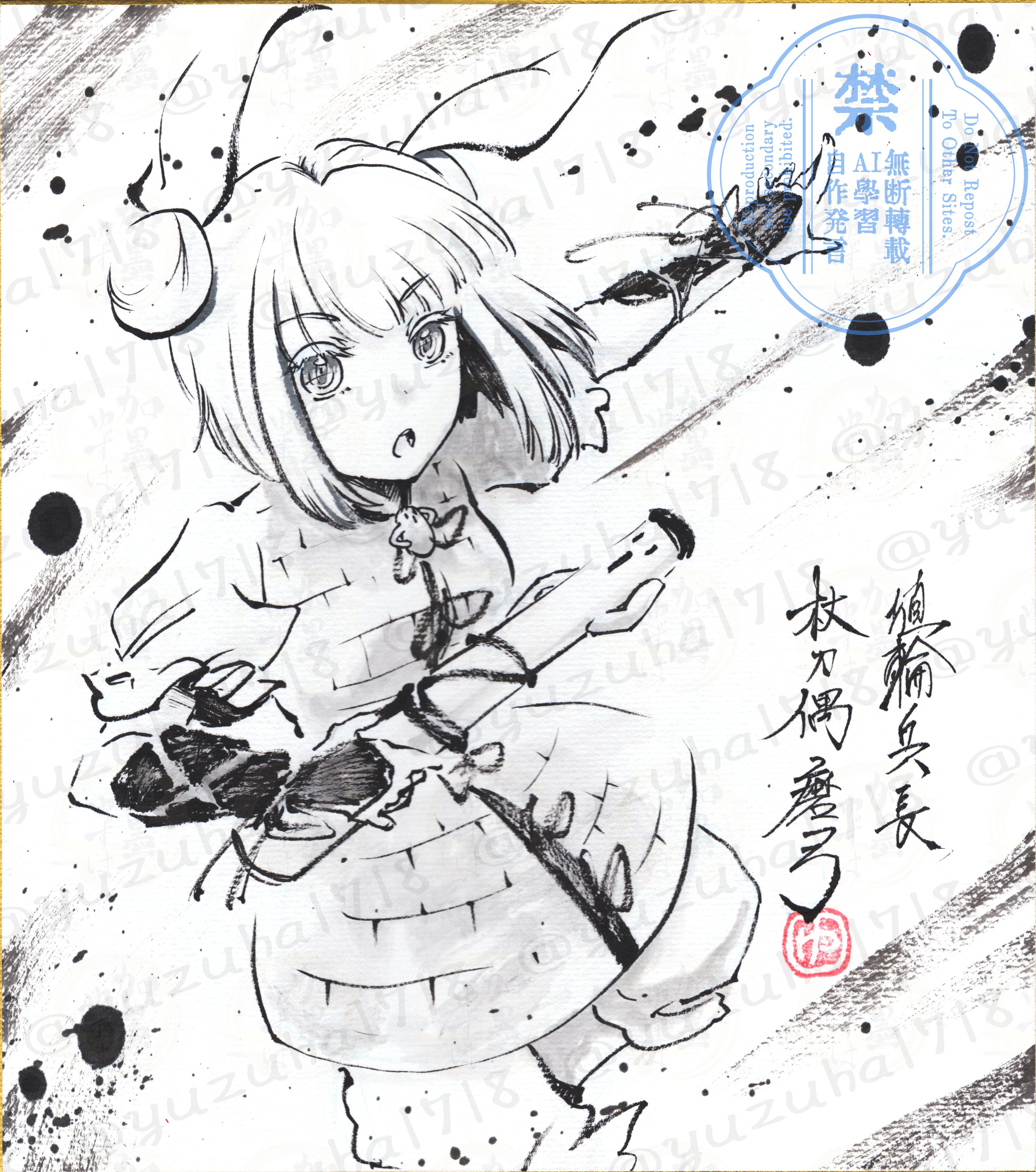 1girl absurdres armor armored_dress commentary commentary_request double_bun dress english_commentary hair_bun hair_ribbon haniwa_(statue) highres joutouguu_mayumi looking_at_viewer medium_hair mixed-language_commentary open_mouth puffy_short_sleeves puffy_sleeves ribbon shikishi short_sleeves solo touhou traditional_media translation_request twitter_username vambraces watermark watermark_grid yuzuha_(yuzutime)