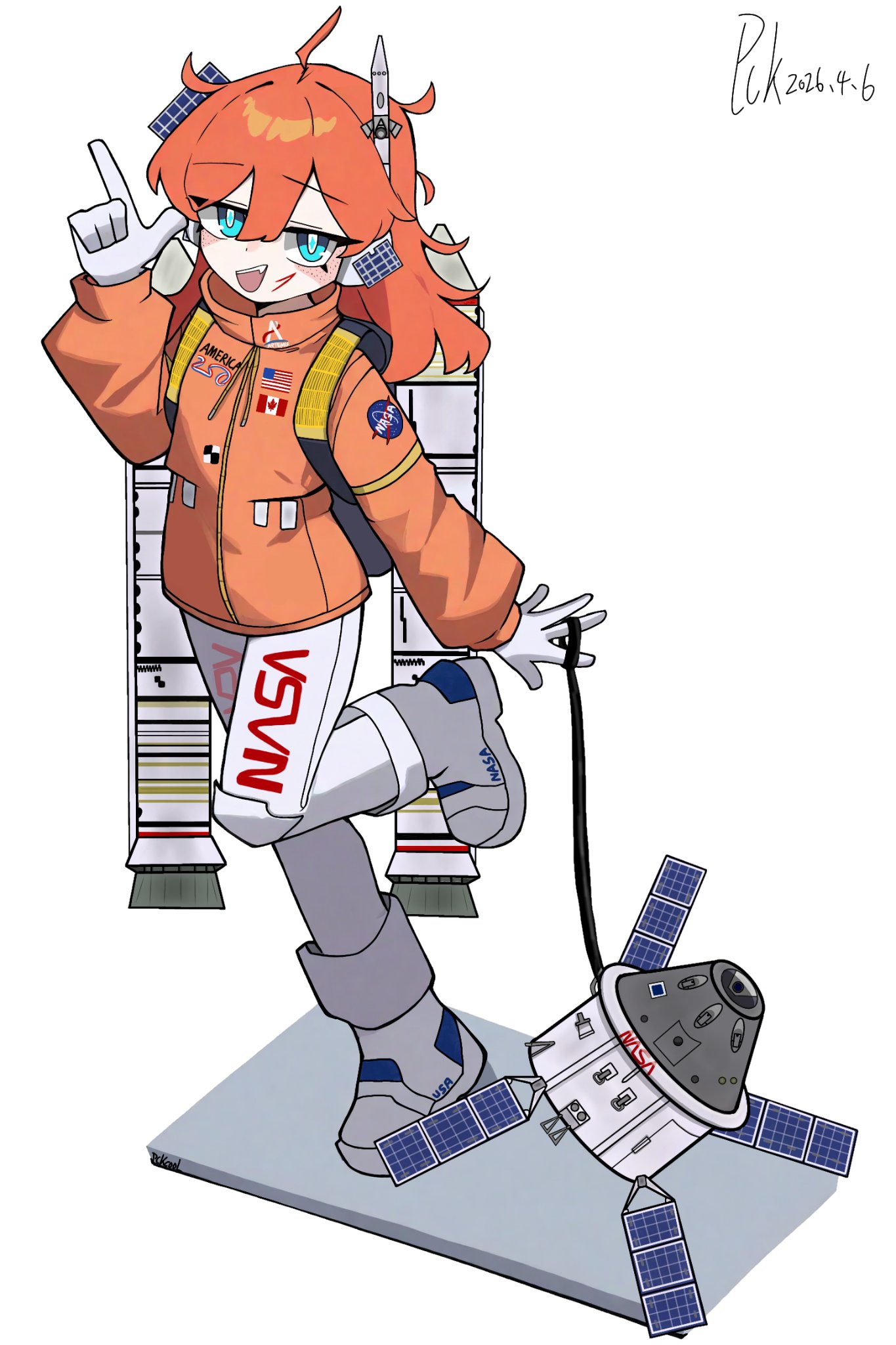 1girl american_flag artemis_ii artemis_program blue_eyes boots countdown_timer dated fang highres logo long_sleeves medium_hair nasa nasa_logo open_mouth orange_hair original orion_(spacecraft) pckcool personification pointing pointing_up signature solar_panel standing standing_on_one_leg twitter_username white_background white_boots