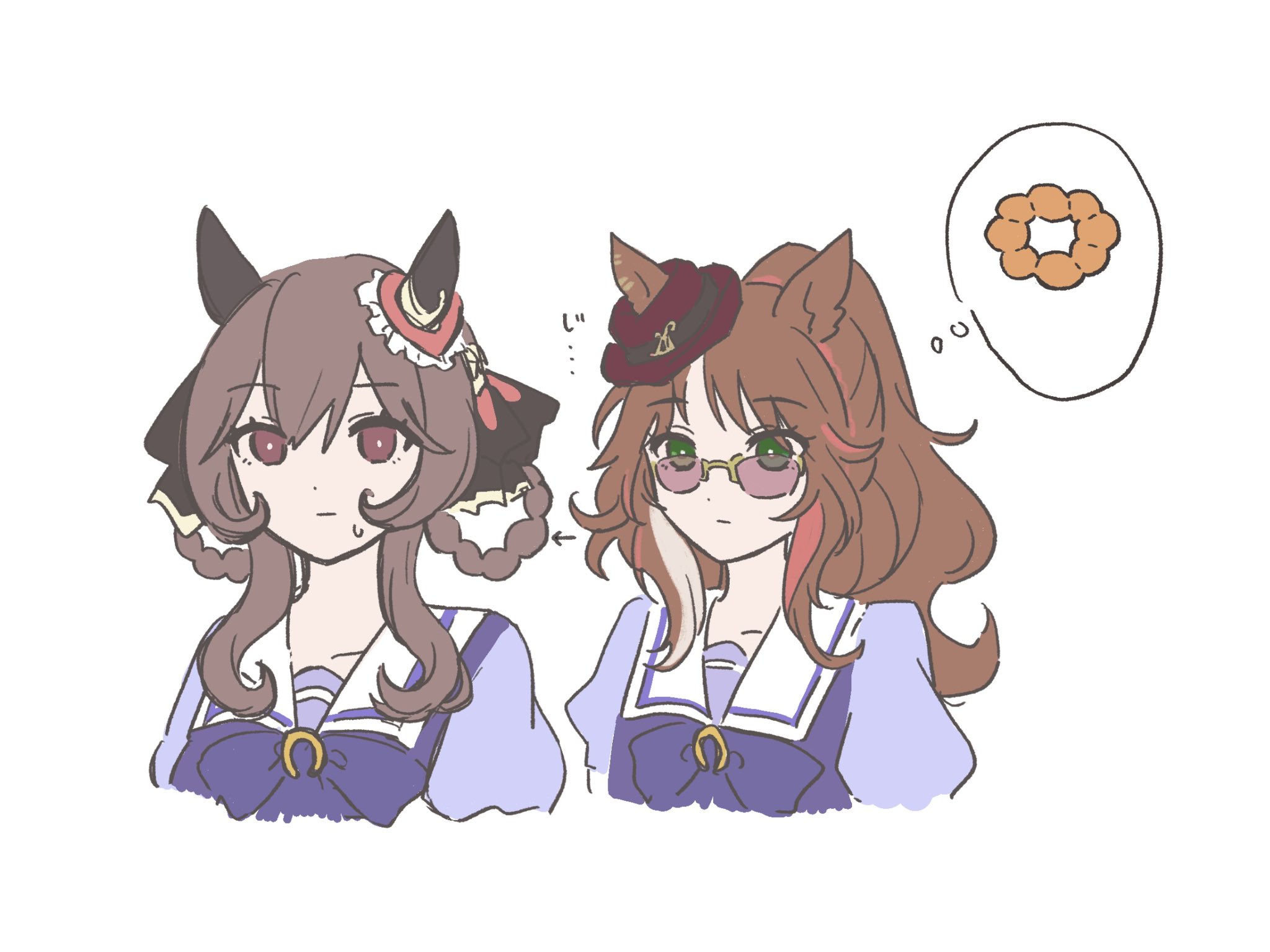 2girls animal_ears arrow_(symbol) bow bowtie braid braided_hair_rings brown_hair closed_mouth commentary_request cropped_torso donut ear_covers ears_through_headwear fedora food forever_young_(umamusume) gentildonna_(umamusume) green_eyes hair_between_eyes hair_ornament hair_rings hat heart-shaped_ornament heart_ear_ornament highres horse_ears horse_girl long_hair looking_at_another moshikashite_s multicolored_hair multiple_girls puffy_short_sleeves puffy_sleeves purple-tinted_eyewear purple_bow purple_bowtie purple_shirt red-tinted_eyewear red_eyes red_streaks sailor_collar sailor_shirt school_uniform shirt short_sleeves simple_background speech_bubble streaked_hair sunglasses sweatdrop thought_bubble tinted_eyewear tracen_school_uniform umamusume white_background white_sailor_collar white_streaks