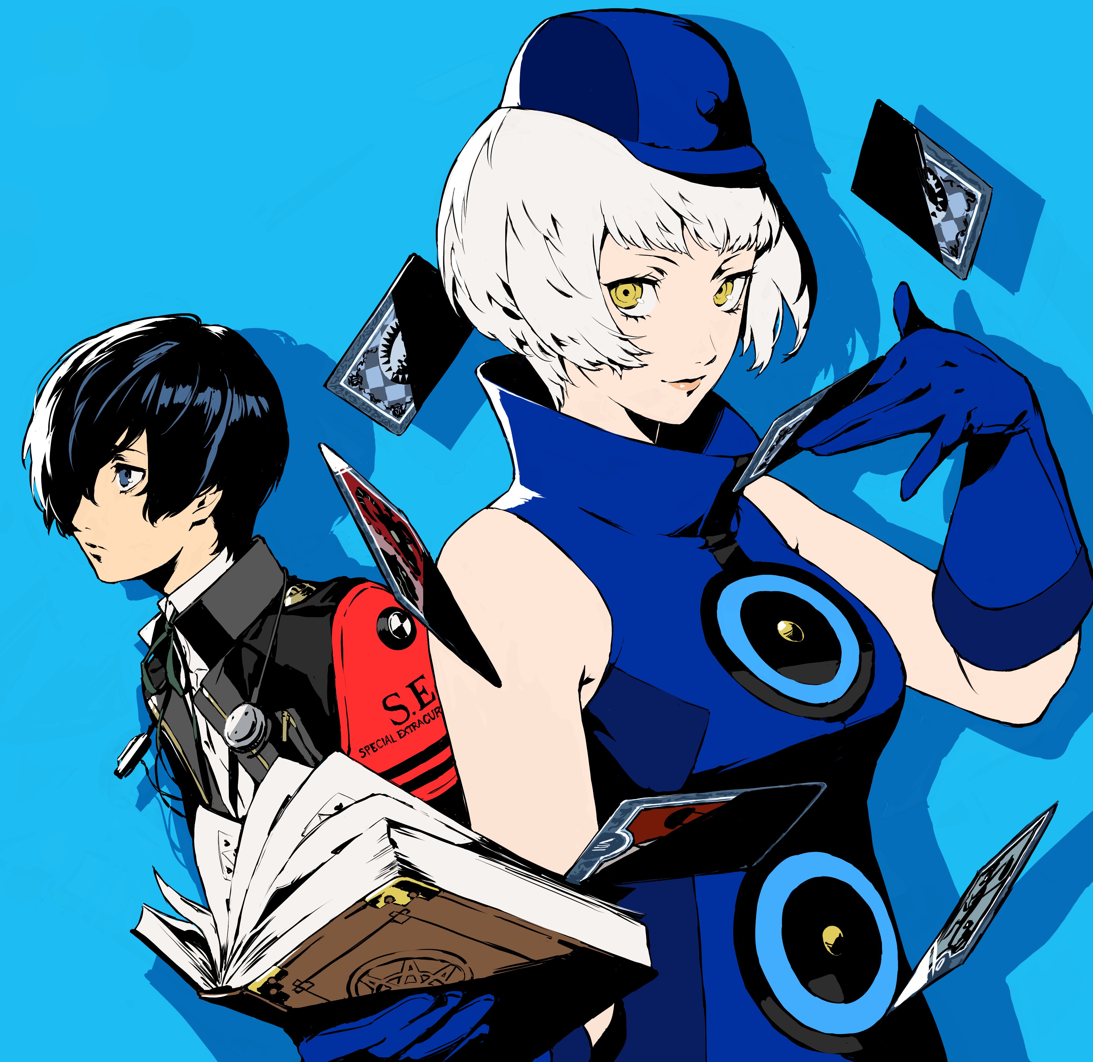 1boy 1girl absurdres arm_up armband asdf_4532 black_jacket blue_background blue_eyes blue_gloves blue_hair blue_hat book breasts card closed_mouth commentary_request dress drop_shadow earphones_removed elizabeth_(persona) from_side gekkoukan_high_school_uniform gloves hat headphones highres holding holding_book holding_card jacket looking_at_viewer looking_to_the_side open_book persona persona_3 persona_3_reload pink_lips red_armband s.e.e.s school_uniform shirt short_hair simple_background sleeveless sleeveless_dress smile tarot tarot_card white_hair white_shirt yellow_eyes yuuki_makoto_(persona_3)