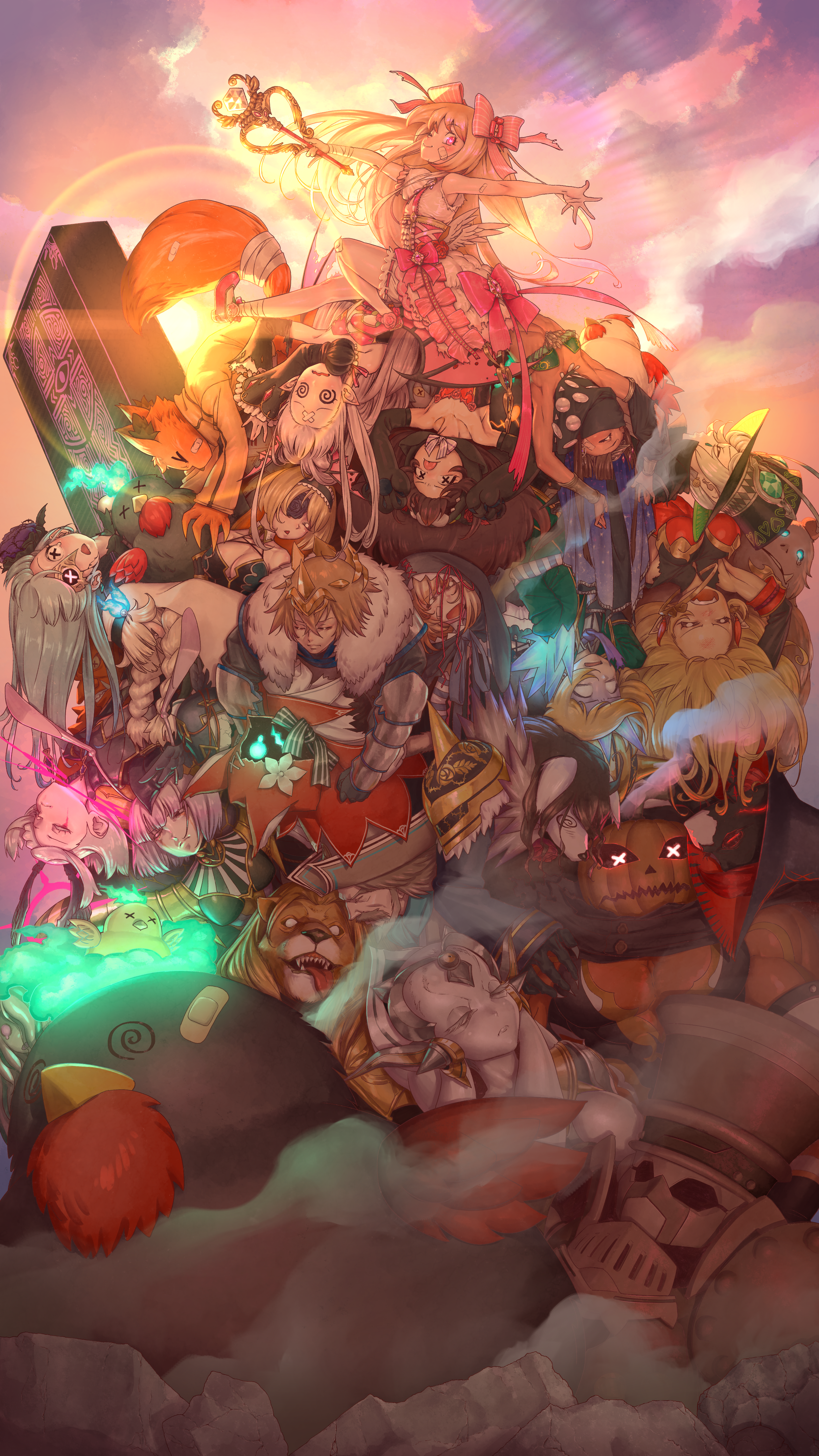 >_< 6+boys 6+girls ;) @_@ absurdres aqua_eyes arabian_clothes armor bandages bandaid bandaid_on_cheek bandaid_on_face bare_shoulders bird black_sleeves blank_eyes blonde_hair braid breasts brown_hair captain_flint_(grimms_notes) chaos_cinderella_(original)_(grimms_notes) chaos_dunyazad_(grimms_notes) chaos_hecate_(grimms_notes) chaos_jeanne_(grimms_notes) chaos_marie_(grimms_notes) chaos_match_girl_(grimms_notes) chaos_pinocchio_(grimms_notes) chaos_red_riding_hood_(grimms_notes) chaos_red_riding_hood_(original)_(grimms_notes) chaos_sun_wukong_(grimms_notes) chaos_witch_(grimms_notes) chicken claws cleavage closed_eyes closed_mouth cloud cloudy_sky cocco_villain_(grimms_notes) colored_skin corset dark-skinned_female dark_skin detached_sleeves earrings egg eye_mask facial_hair fairy_(grimms_notes) fairy_servant_(grimms_notes) flower flower_in_eye fox_girl full_body fur_trim furry furry_female furry_male gem glowing glowing_eyes green_gem grey_hair grimms_notes guard_(grimms_notes) hair_ribbon halo hat heart heart-shaped_pupils highres holding holding_wand hood hood_up horns injury jack-o'-lantern_(grimms_notes) jewelry king_lackland_(grimms_notes) kung_fu_villain_(grimms_notes) lion_boy little_red_wolf_(grimms_notes) long_hair lost_epitaph_(grimms_notes) mask mecha mega_cocco_(grimms_notes) mirror_plate_fiend_(grimms_notes) mko_(artist) monster monster_girl mouth_veil multiple_boys multiple_girls muscular muscular_male mustache necklace noble_heart_(grimms_notes) one_eye_closed open_mouth orange_fur orange_hair outstretched_arms pauldrons pink_eyes pink_ribbon pink_wings profile pumpkin_head purple_hair queen_biora_(grimms_notes) red_corset red_oni_(grimms_notes) red_shoes ribbon riccardo_(grimms_notes) robot rubble shadow_bete_(grimms_notes) shadow_carmilla_(grimms_notes) shadow_kai_(grimms_notes) shadow_red_rose_(grimms_notes) shoes short_hair shoulder_armor sitting sky smile smoke spiked_pauldrons spikes sunset sweater symbol-shaped_pupils symbol_in_eye tongue tongue_out top_hat torn_clothes torn_sleeves twin_braids unconscious veil wand white_skin wings x_x yahoo_(grimms_notes)