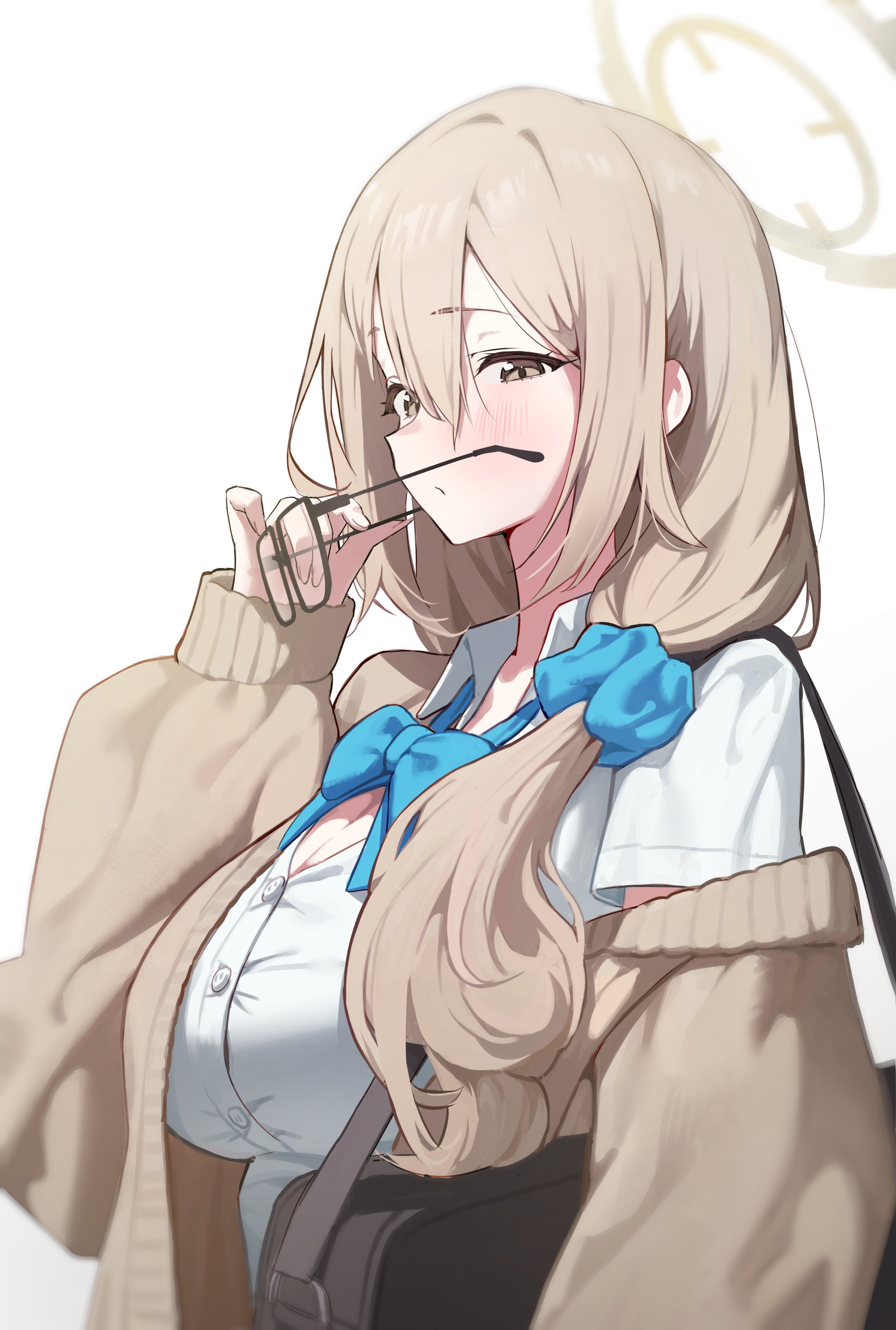 1girl absurdres akane_(blue_archive) bag black_bag blue_archive blue_bow bow bowtie breasts brown_eyes brown_hair cardigan halo highres long_hair looking_at_viewer open_cardigan open_clothes open_mouth shirt simple_background solo white_background white_shirt yona_(yoroyoro)