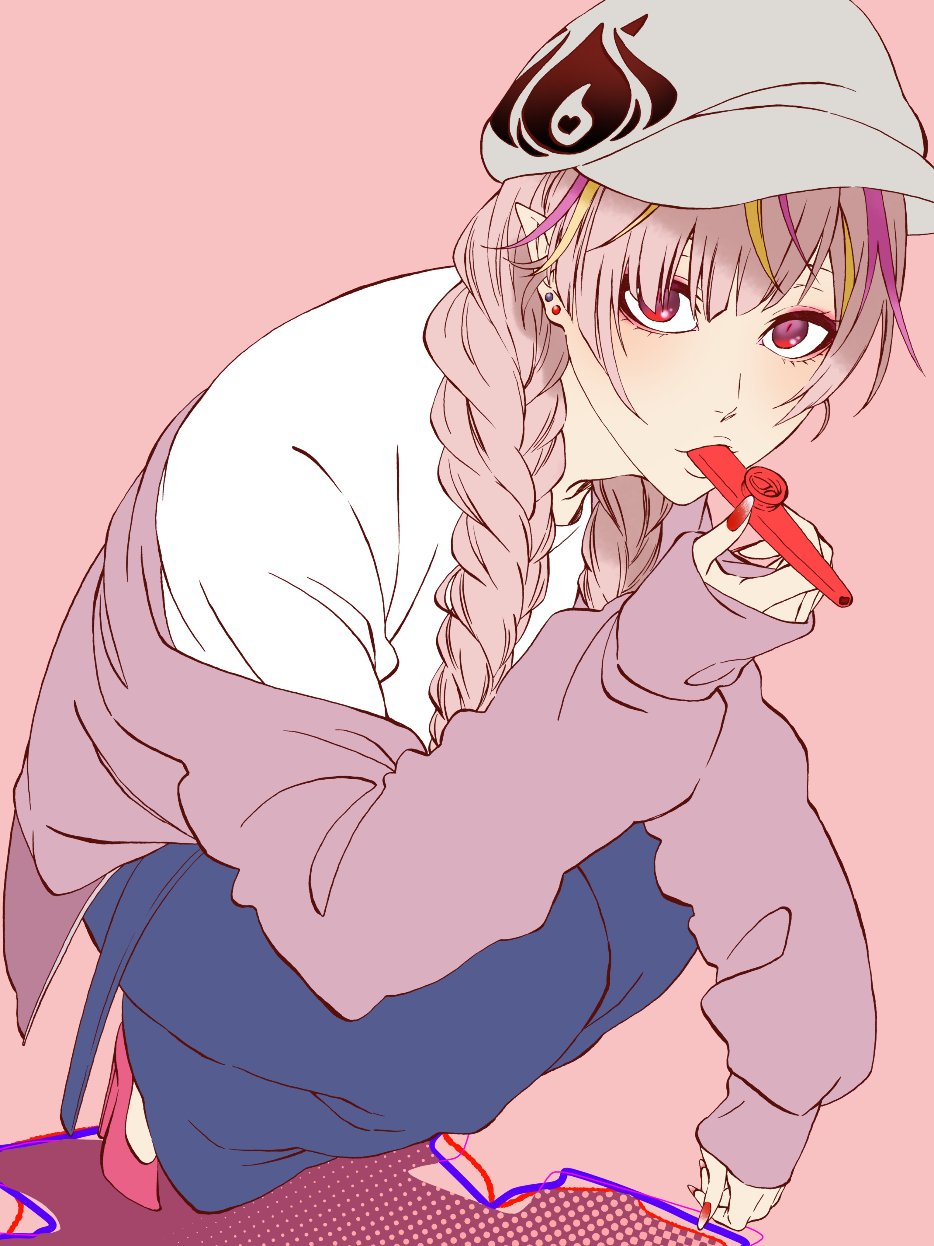 1girl absurdres blonde_hair braid braided_twintails commentary earrings halftone_shadow hat highres holding_kazoo indie_virtual_youtuber instrument jacket jacket_partially_removed jewelry kazoo ken'ichi_(ken1ro_u) long_hair looking_at_viewer mela_akaru multicolored_hair pink_background pink_hair pink_shoes pointy_ears purple_hair red_eyes red_nails shirt shoes sleeves_past_wrists solo squatting streaked_hair twin_braids untranslatable_commentary virtual_youtuber white_shirt