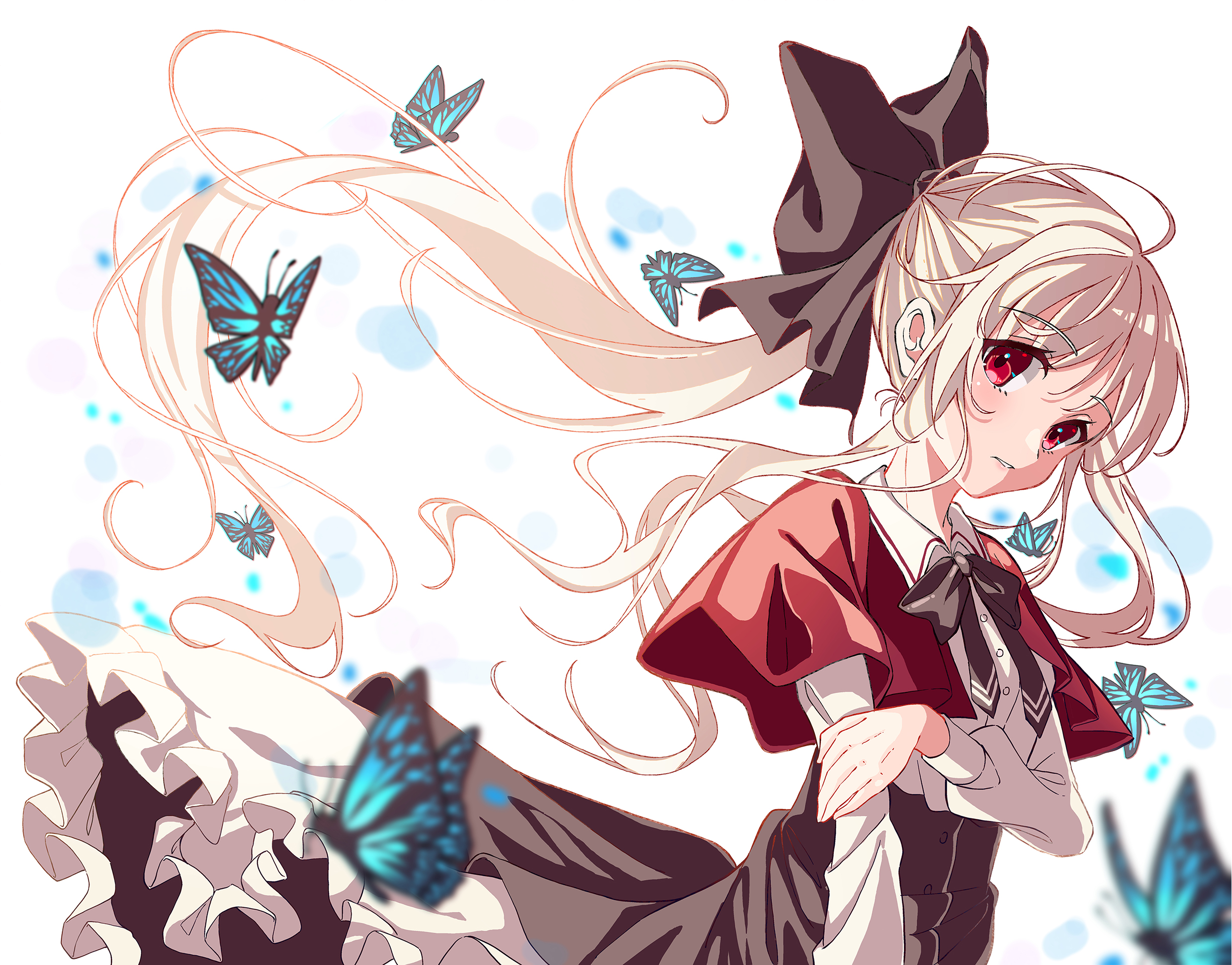 1girl black_bow black_bowtie black_skirt blonde_hair blue_butterfly blurry blush bow bowtie bug butterfly capelet collared_shirt commentary cowboy_shot depth_of_field eden_they_were_only_two_on_the_planet eyes_visible_through_hair floating_hair frilled_skirt frills hair_between_eyes hair_bow hand_on_own_arm he_shan123 high-waist_skirt highres huge_bow insect light_particles long_hair long_sleeves looking_at_viewer parted_lips puffy_long_sleeves puffy_sleeves red_capelet red_eyes shirt sidelighting sidelocks simple_background sion_(eden) skirt solo tareme very_long_hair white_background white_shirt