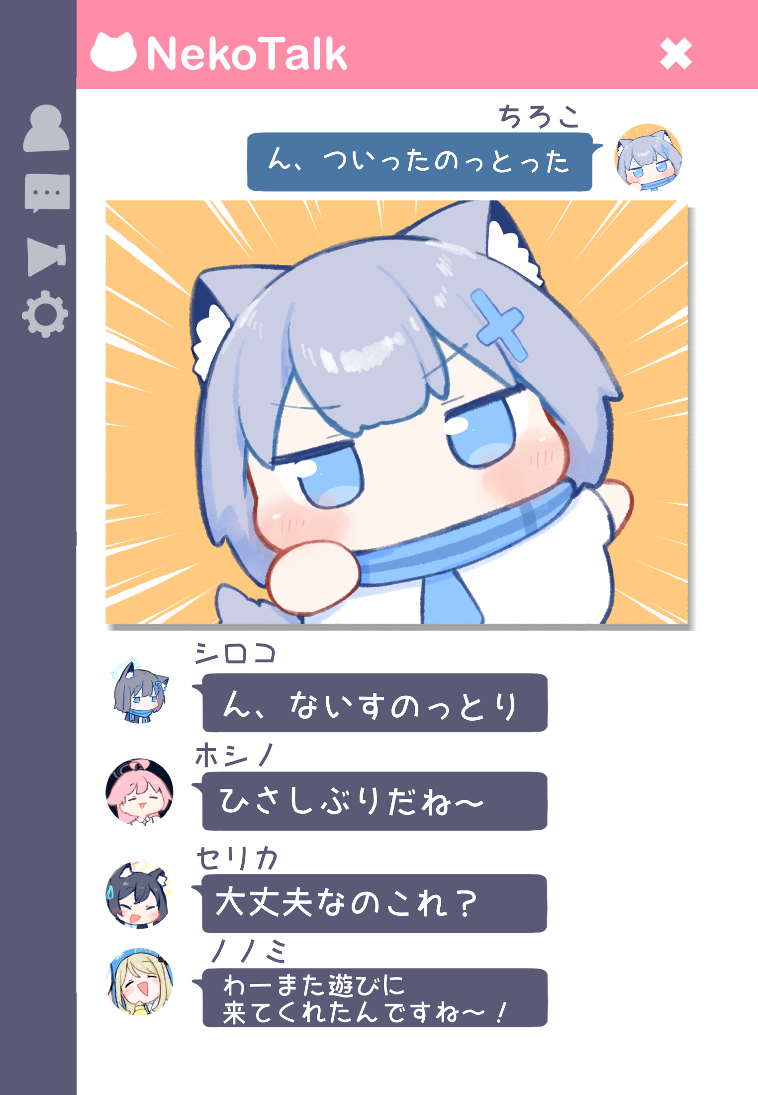 animal_ears blue_archive blue_eyes blue_scarf chibi commentary_request grey_hair highres hoshino_(blue_archive) looking_at_viewer momotalk_(blue_archive) nonomi_(blue_archive) scarf serika_(blue_archive) shiroko_(blue_archive) speech_bubble translation_request urode wolf_ears wolf_girl