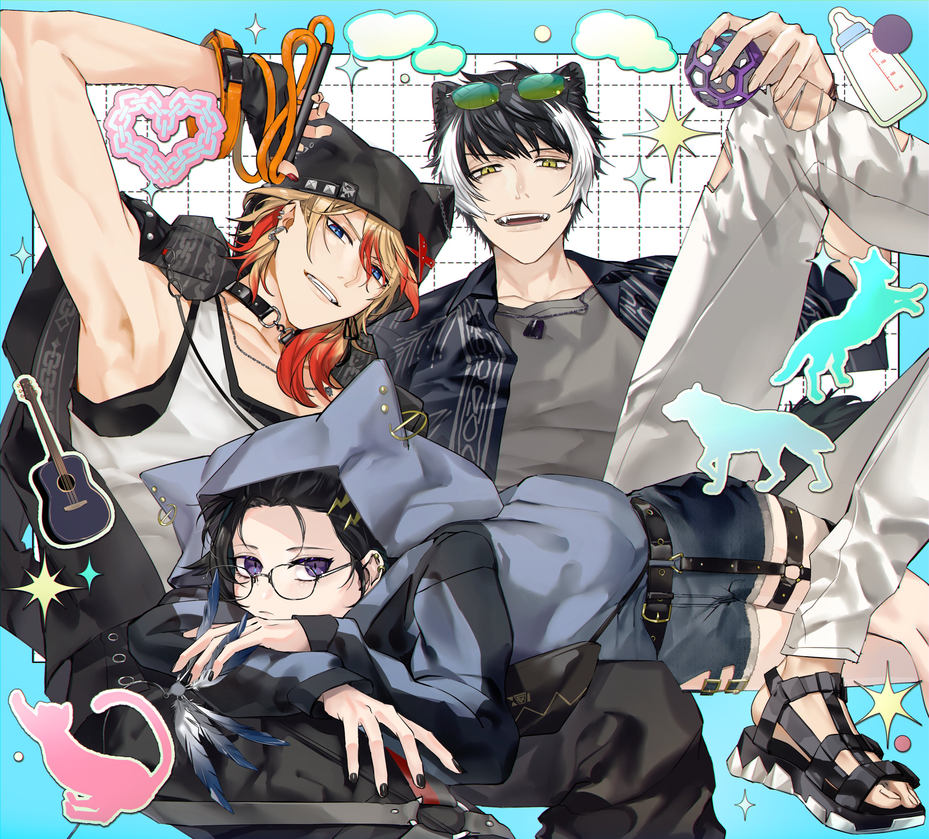 3boys absurdres animal_ears animal_hat armpits axel_syrios axel_syrios_(2nd_costume) baby_bottle belt black_belt black_choker black_hair black_hat black_nails black_pants black_sandals blonde_hair blue_background blue_hoodie blue_shorts bottle choker denim denim_shorts dog_tags eyewear_on_head feet_out_of_frame foot_out_of_frame glasses green-tinted_eyewear grey_shirt grid_background guitar hair_ornament hat highres holostars holostars_english hood hoodie instrument jackal_boy jackal_ears jewelry kageyama_shien kageyama_shien_(3rd_costume) kanade_izuru kanade_izuru_(3rd_costume) lightning_bolt lightning_bolt_hair_ornament lightning_bolt_symbol low_ponytail lying_on_lap lying_on_person male_focus medium_hair multicolored_hair multiple_boys nail_polish naizou_bug necklace official_alternate_costume outline pants ponytail red_hair red_streaks sandals shirt short_hair shorts sitting sleeveless sticker streaked_hair tank_top thigh_strap tinted_eyewear toes torn_clothes torn_pants virtual_youtuber white_background white_hair white_outline white_pants white_streaks white_tank_top